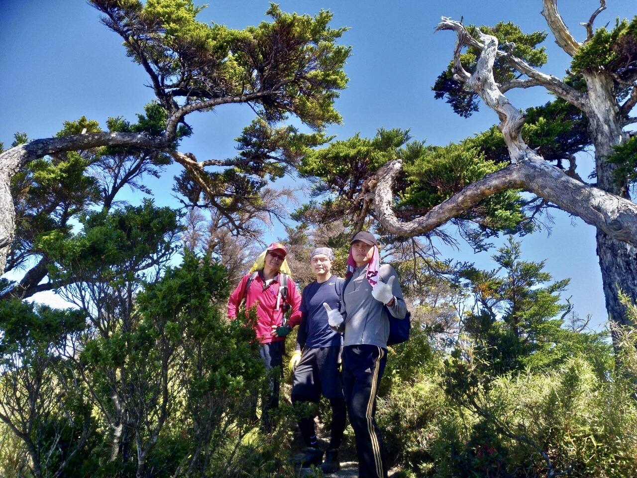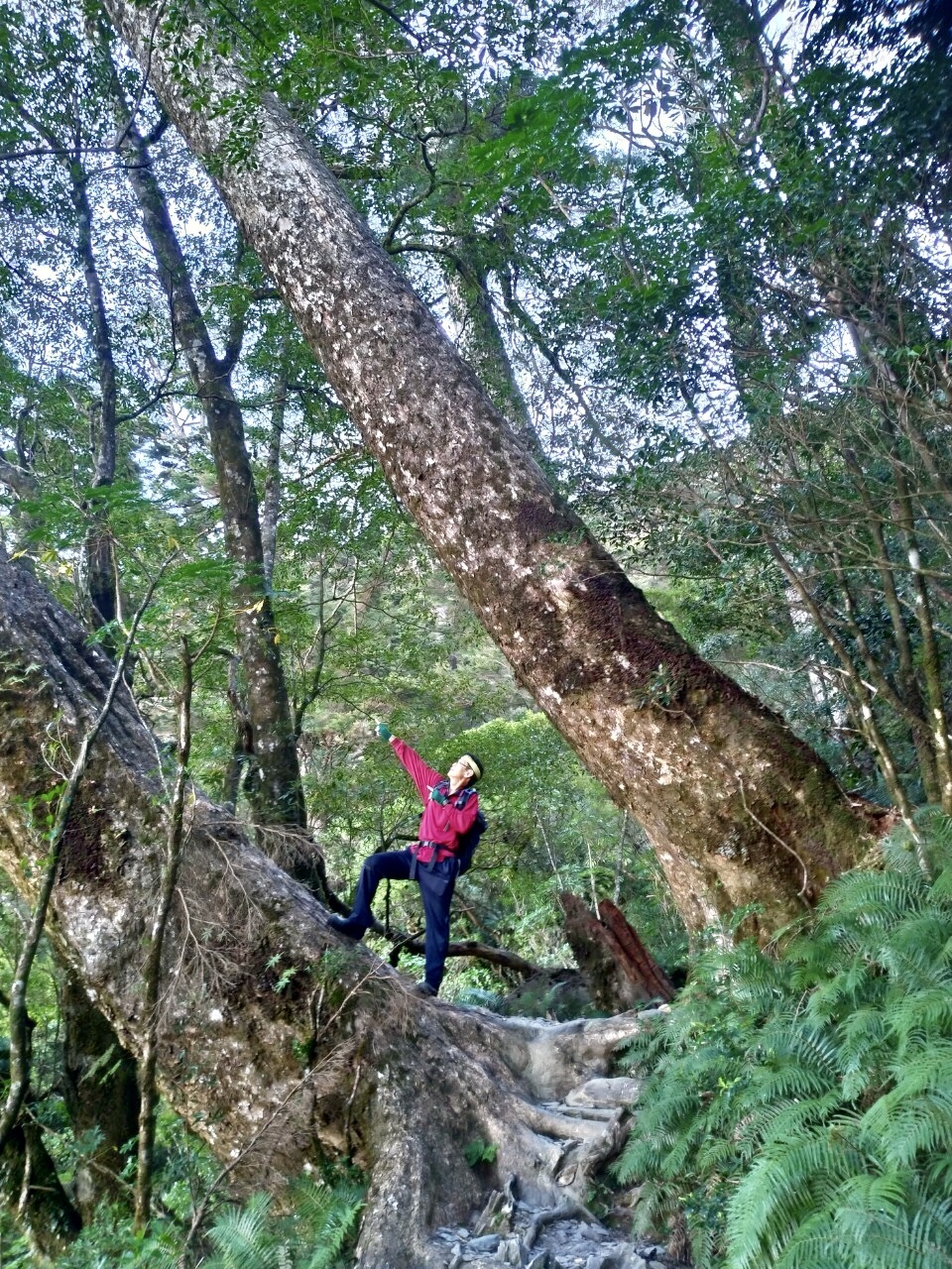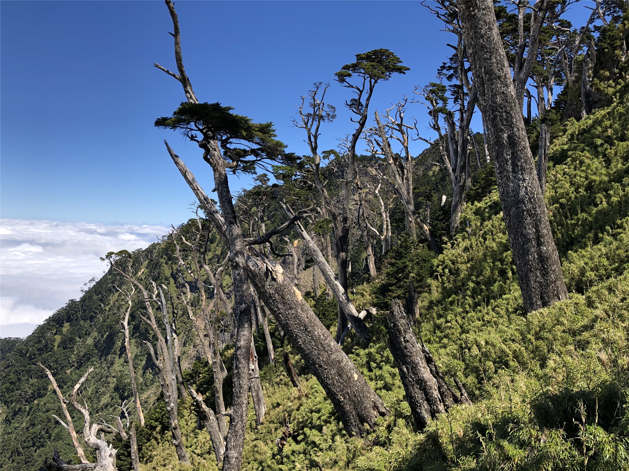 13:46回最後水源,彥成下山因未穿雨鞋,止滑效果差,腳稍有不適,利用這個機會我們放慢腳步,欣賞北大武山稜線最精華的一段,鐵衫以不同的面貌呈現強勁的生命力,盡釋天地之美;取回爐具小休後續行。