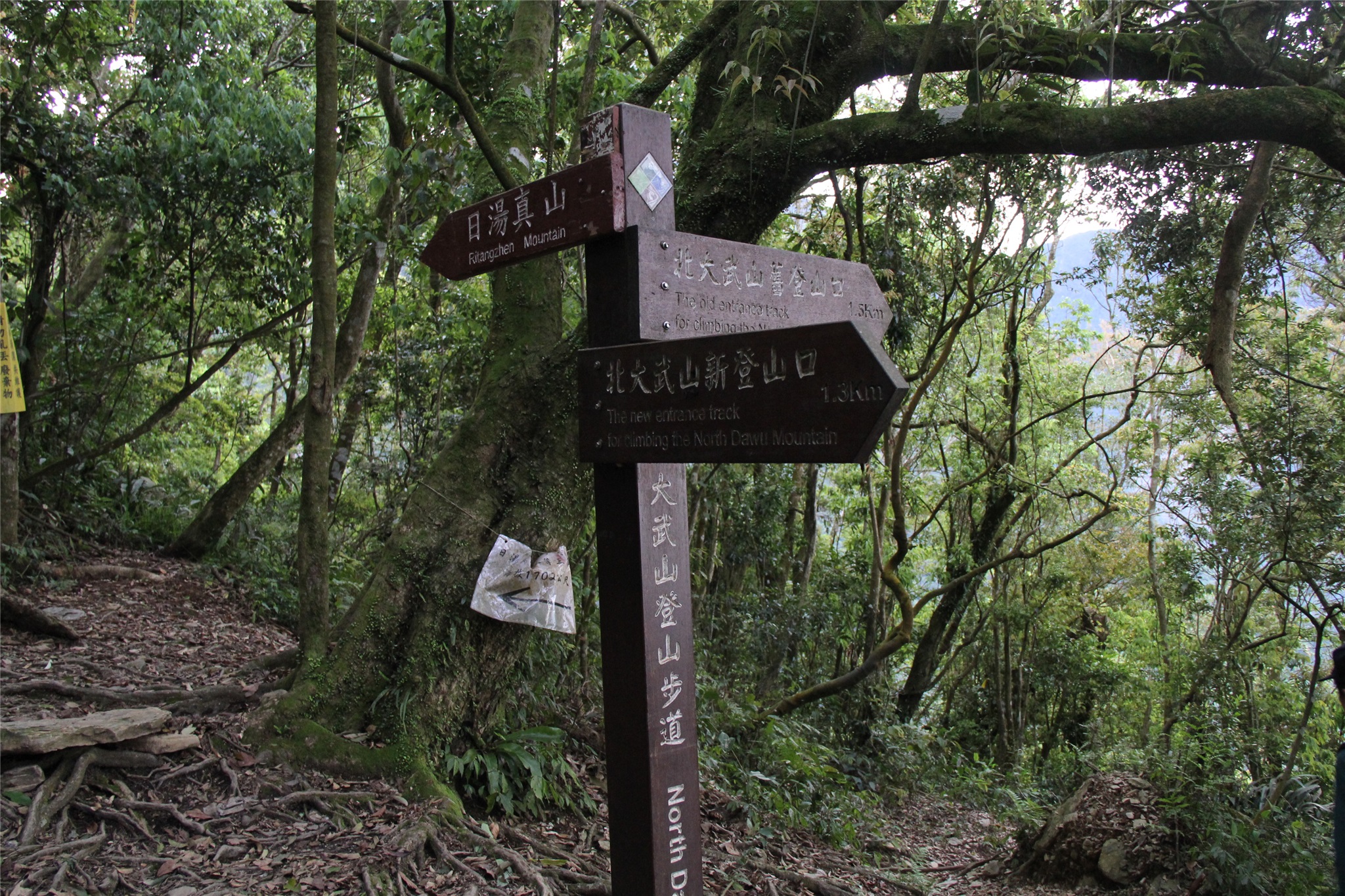04:43日湯真山岔路(005),H1452 m,有路標指示:『左往日湯真山,回往新登山口1.3K,右往舊登山口1.5K』,取右續行。