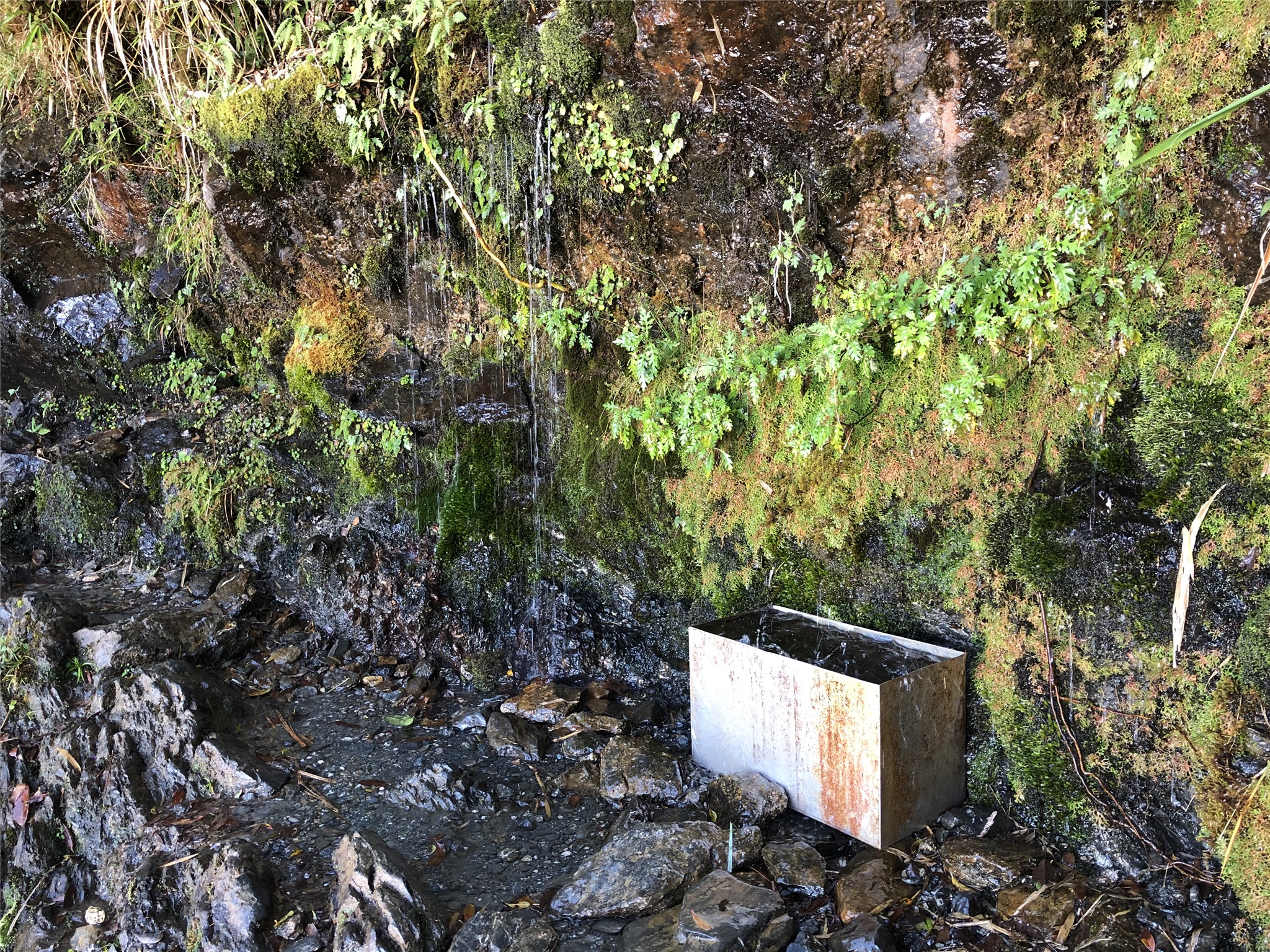 09:00~09:45最後水源(017),H2627 m,約步道6.3K,右側岩壁水源不斷滲出,岩壁下有不鏽鋼鐵桶承接;左側箭竹林內有一小空地可以坐下休息,每次單攻北大武山都會選擇在這裡泡茶消遙一番,一般單攻客很少這樣墮落;觀察阿昇和彥成雖然疲憊,精神狀態尚可,最後的2.7公里就看他們意志力如何發揮,且戰且走;泡茶後將爐具留下,回程再取回。