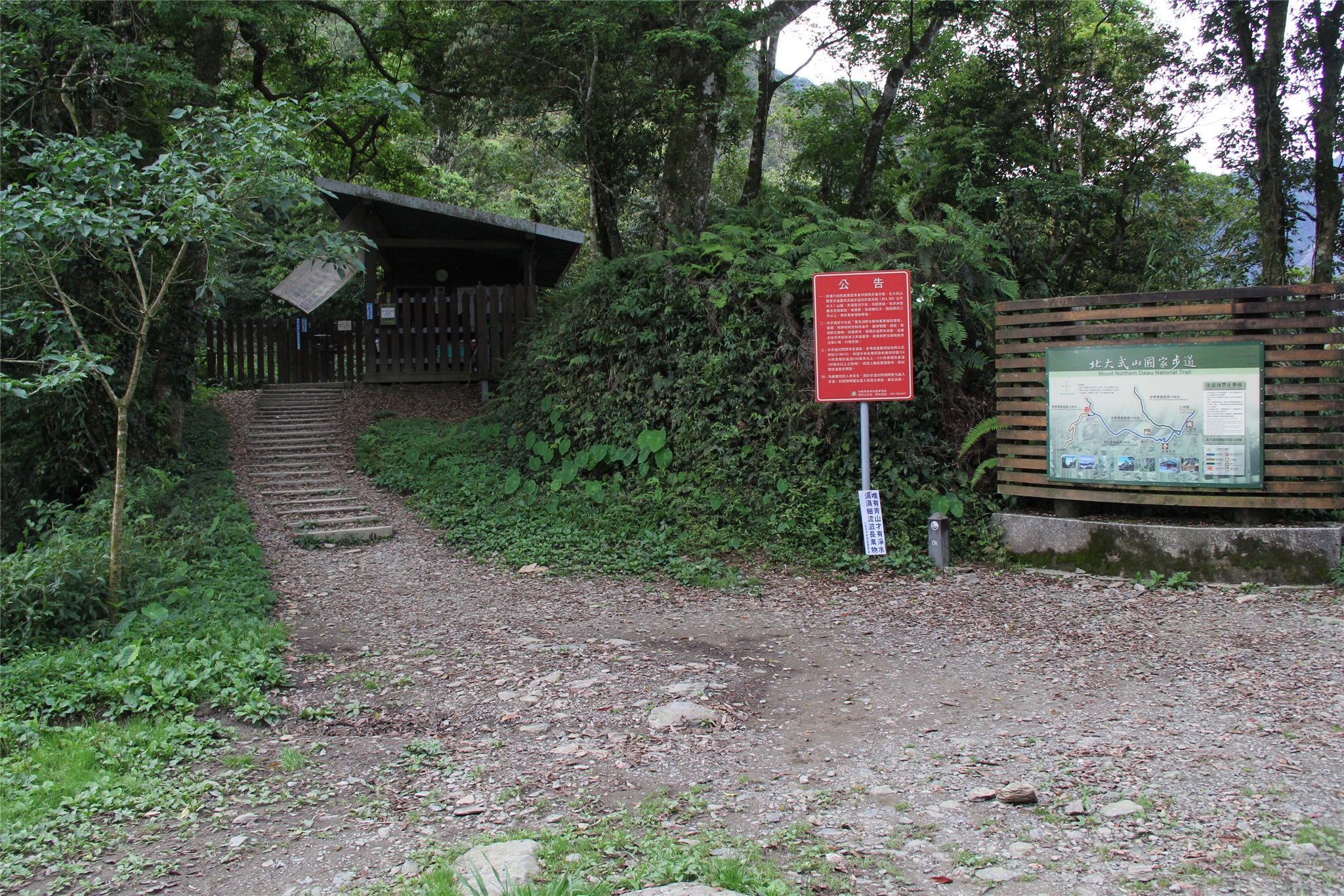 05:10舊登山口管制站(006),H1519 m,前有一個大廣場,88風災之前都直接開車到這裡;天還沒亮仍帶著頭燈,管理員還沒到,桌上有入山登記名冊,但原子筆寫到一半沒水了,只得就罷,投下入山證後逕自上山。