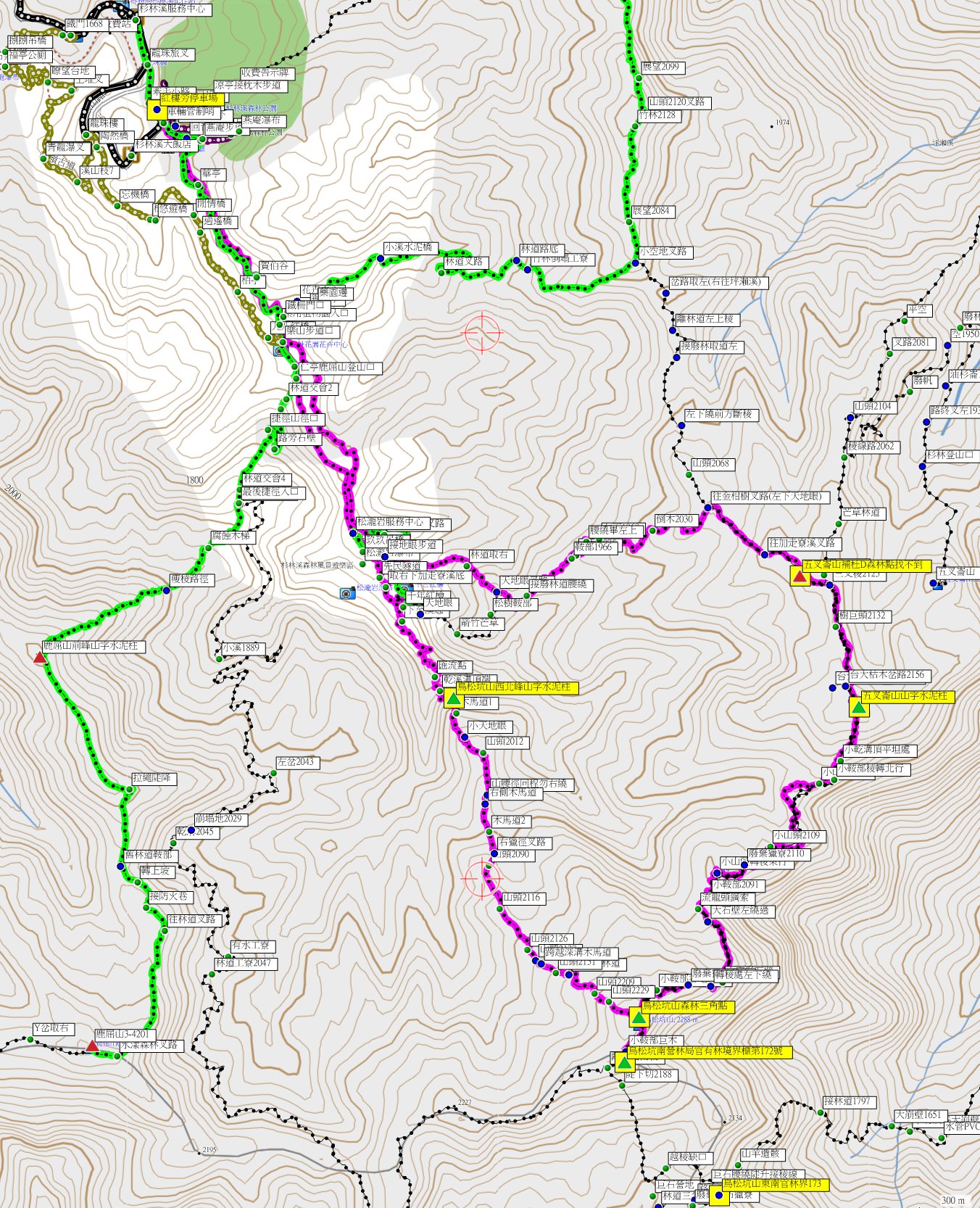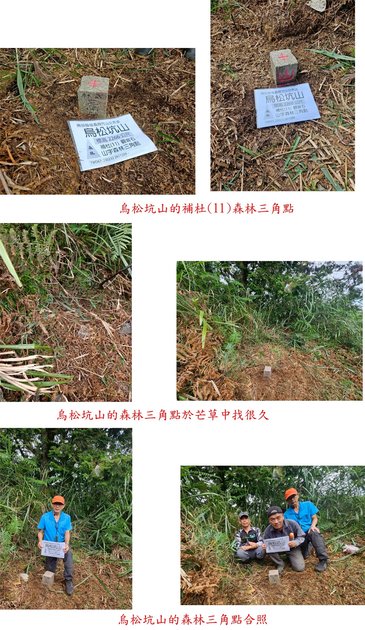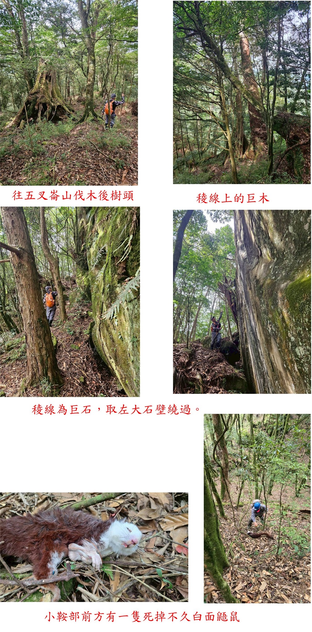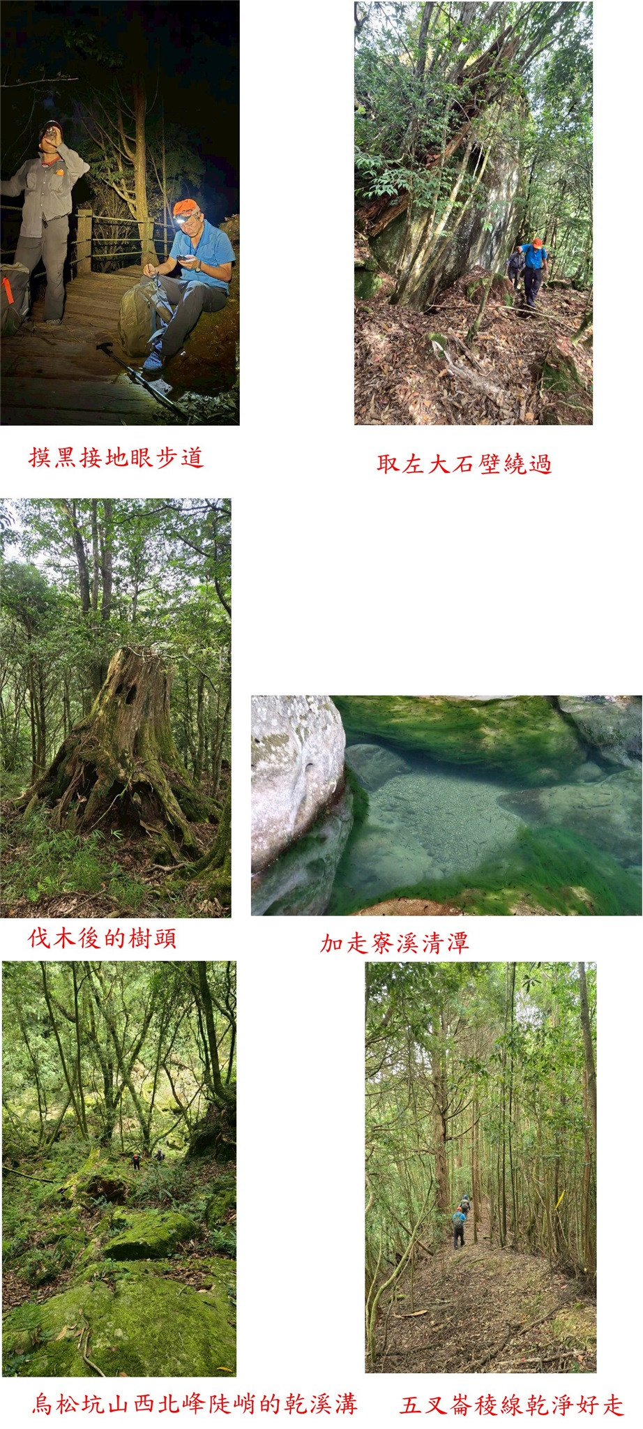 10/19約山友去走烏松坑與五叉崙等山環繞路線,杉林溪7點開園進入後停車於紅樓旁,踢馬路到松瀧岩服務中心,走步道至千年檜木下加走寮溪的溪底,上溯至匯流點登山口,取左陡峭乾溪谷走一小段,再來為連續的陡峭的石壁地形,翻過一菱形的岩壁地形,上方即烏松坑山西北峰的山字水泥柱,上山走1小時又42分鐘。第2顆為烏松坑山的森林三角點,續順稜而行山徑乾淨好走,沿途有許多伐木後樹頭、鋼索與木馬道遺跡,還有許多山老鼠的傑作,走了2小時又15分抵達烏松坑山,山頂芒草密布,找了半小時方尋獲基石,此點係第2度造訪。第3顆為烏松坑南的營林局官有林境界標第172號,順稜南行為短箭竹或芒草不好走,走15分鐘抵斷頭的基石。第4顆為五叉崙山的山字水泥柱,原路回到烏松坑山,順稜東行路況奇差一路奮戰,下到谷地續上,再陡降至轉稜點;稜線轉北行,路徑不明沿途路條稀疏,經常要覓路而行,稜線有許多地圖上看不到的小山頭,上上下下費時又費力,由烏松坑山過來走了2小時又57分鐘,終於抵達基石。第5顆為五叉崙山西的補杜D的森林自然石三角點,續順稜北行路況轉佳,走31分鐘抵達補杜D位置,平坦地佈滿松針,自然石有可能埋於腐植土中找不到。續順稜北行路況佳,走5百餘公尺分叉路,取左路況極佳的支稜行,山徑一路往下,翻過數過小山頭接到廢棄林道,最後一段摸黑,走了2小時接到地眼步道,前接樂山步道出花卉中心,再走段馬路回到紅樓停車處。此行繞一圈費時12小又31分鐘有夠辛苦。