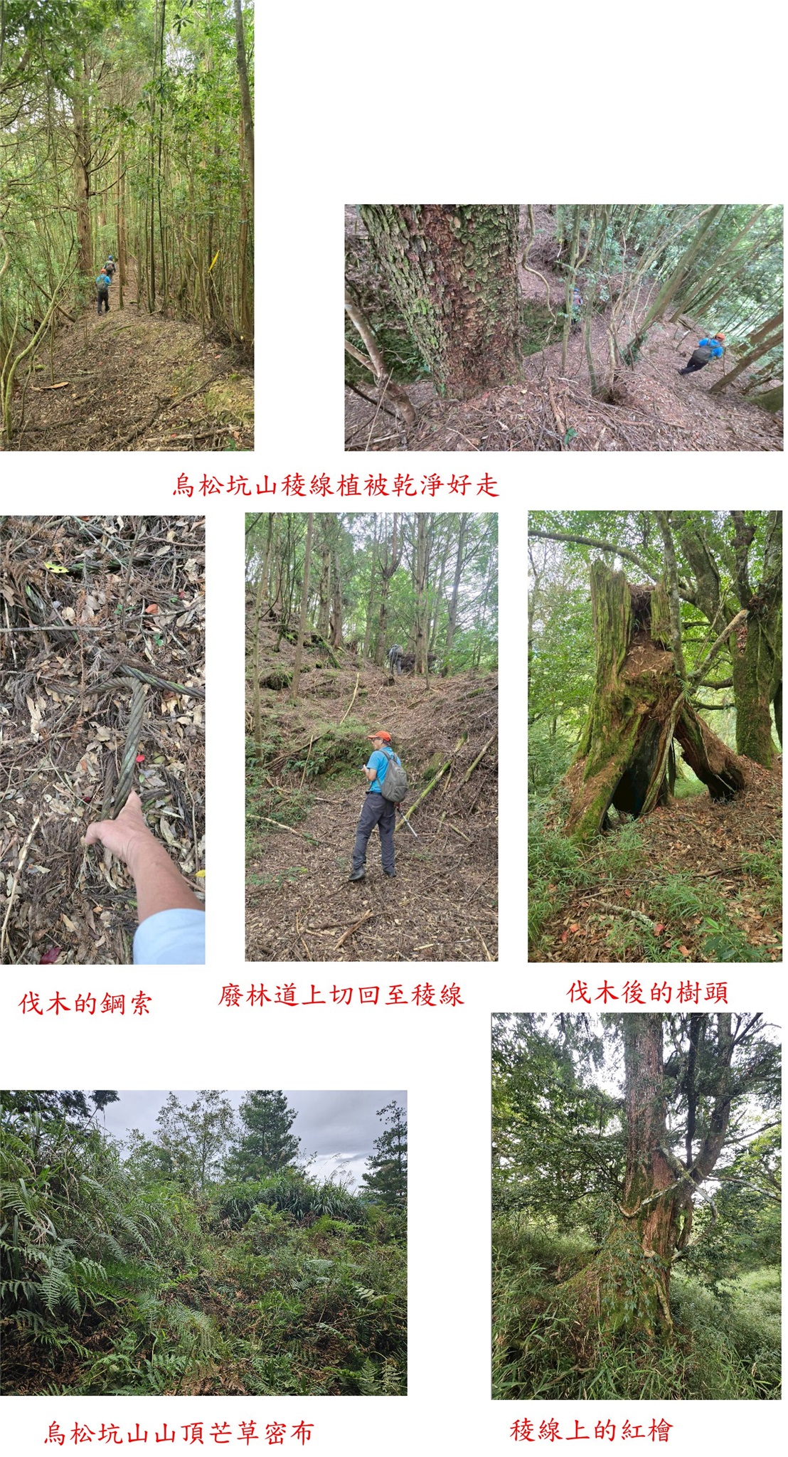12:41回到烏松坑山森林點,改走東北支稜緩下,芒草與短箭竹密佈一路奮戰,此稜應有段時間沒山友走過路況差,前方有一小段稜線植被乾淨。