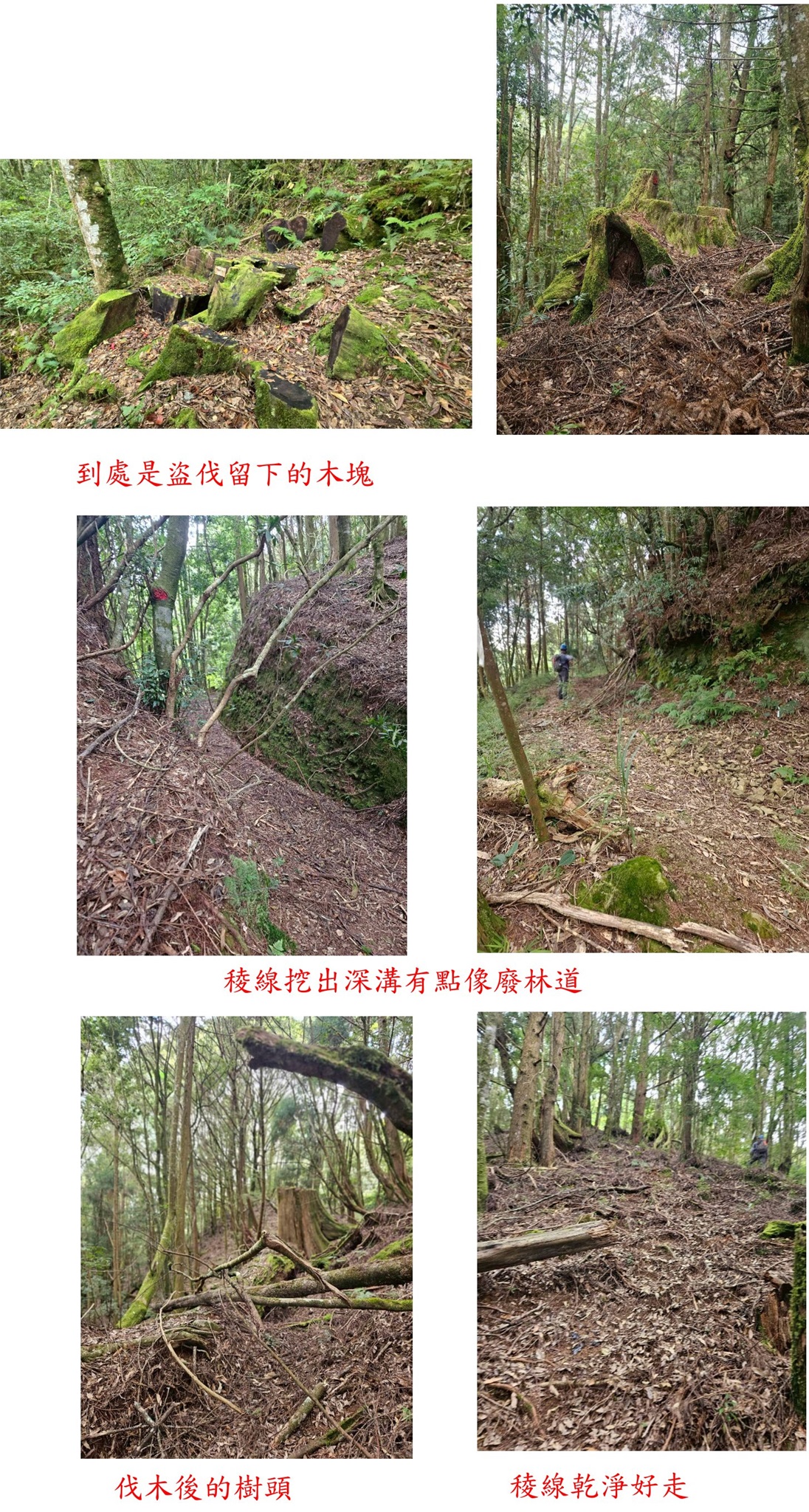 09:14續行,路徑轉為明顯,山徑陡上,有山老鼠留下廢棄的帆布等,到處是盜伐留下的木塊,前有一不明顯的木馬道;回頭可俯瞰杉林溪遊客中心。