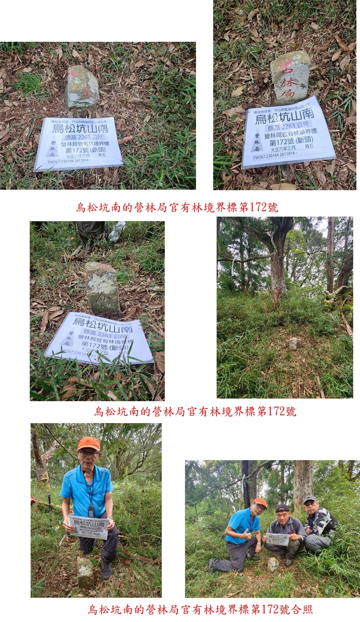 12:05△烏松坑南峰,高2261公尺,營林局官有林境界標第172號,頂端破損,設立於大正六年三月;此點係Leo山友數年前發表的,此稜續南行可通往松山3-5027,另有顆境界標120號,7777山友告知此稜尚有顆境界標待探勘;此山東南面鞍部叉路,尚有顆烏松坑山東南官林界173號,今日本計畫順訪此點,但早上入園時間耽擱,時間不足放棄此點。