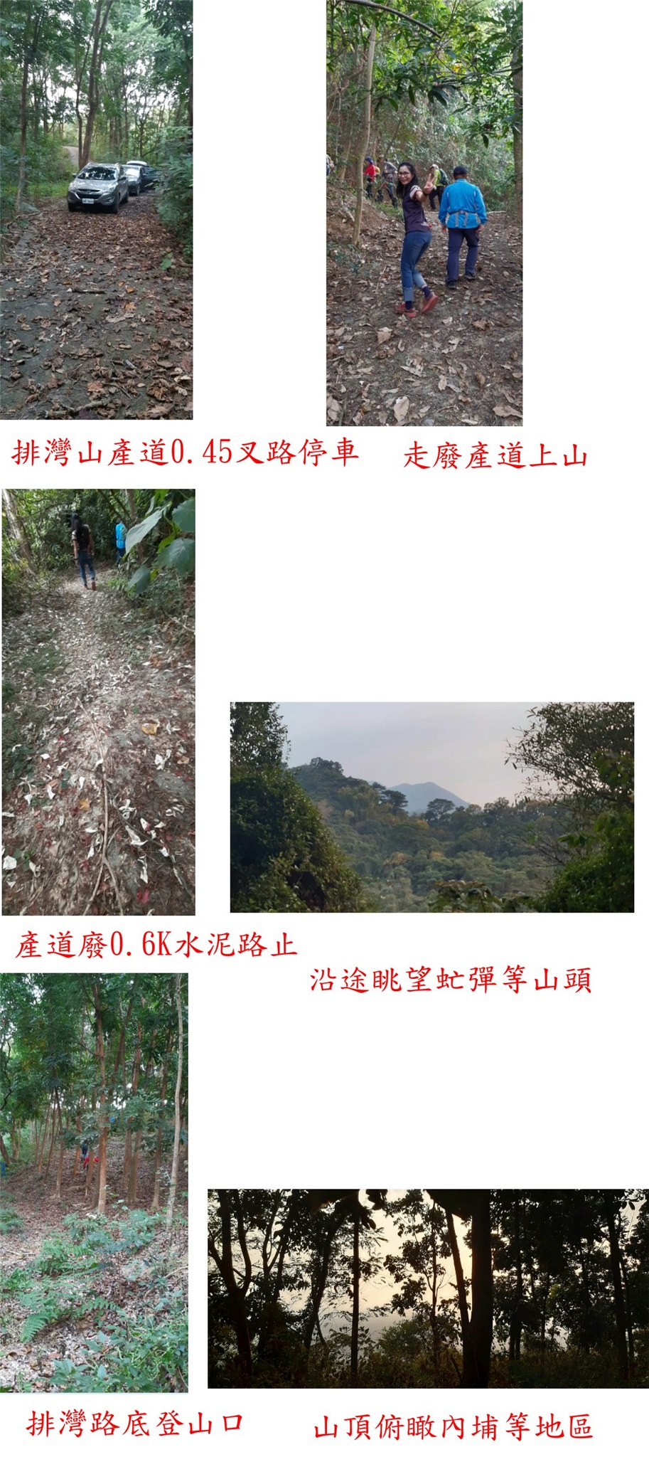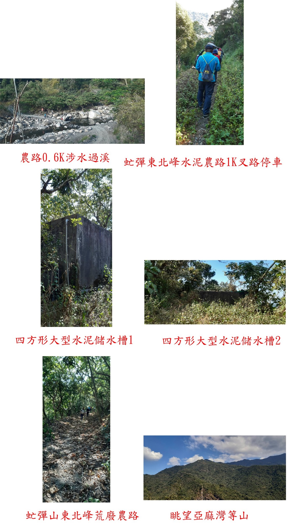 由虻彈山東北峰原路回至185線36.85K叉路,右轉185線(沿山公路)往北走1.4K叉路(35.4K處)【0K】,路口有排灣社區公墓指標;右轉水泥路前行至.0.2K叉路,取右續行至0.45叉路停車,高