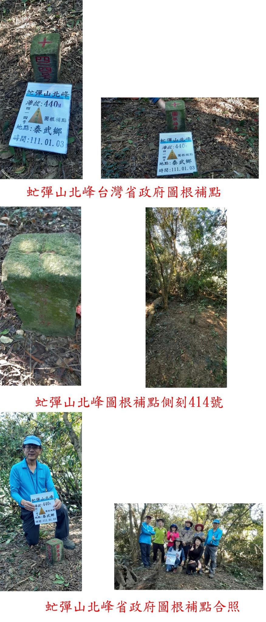 1、虻彈山北峰:位於屏東縣泰武鄉,標高440公尺,台灣省政府圖根補點,側刻414號;座標213179 2501968。