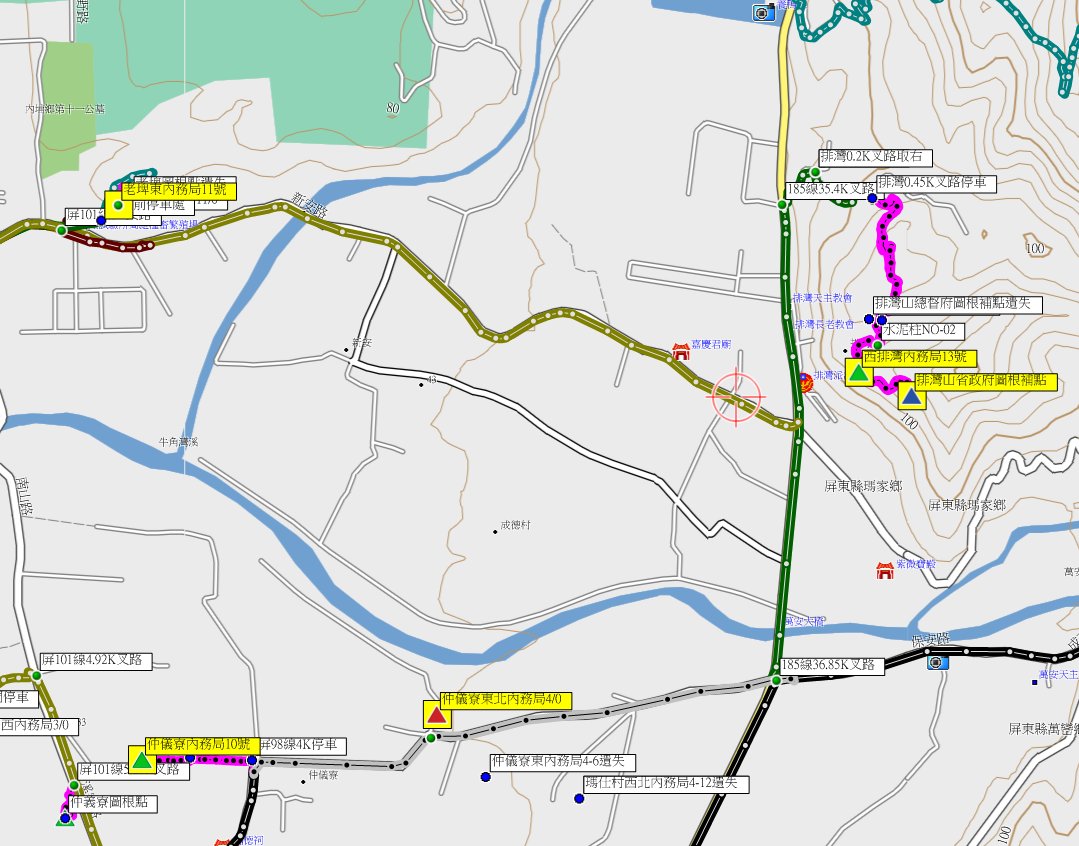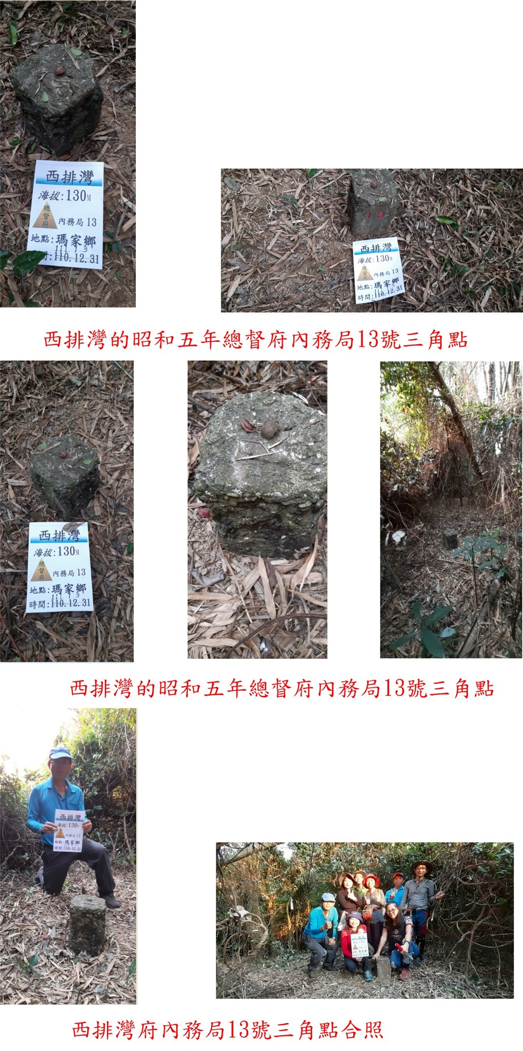 3、西排灣:位於屏東縣瑪家鄉,標高135公尺,昭和五年總督府內務局13號三角點水泥柱;座標210950 2503610。