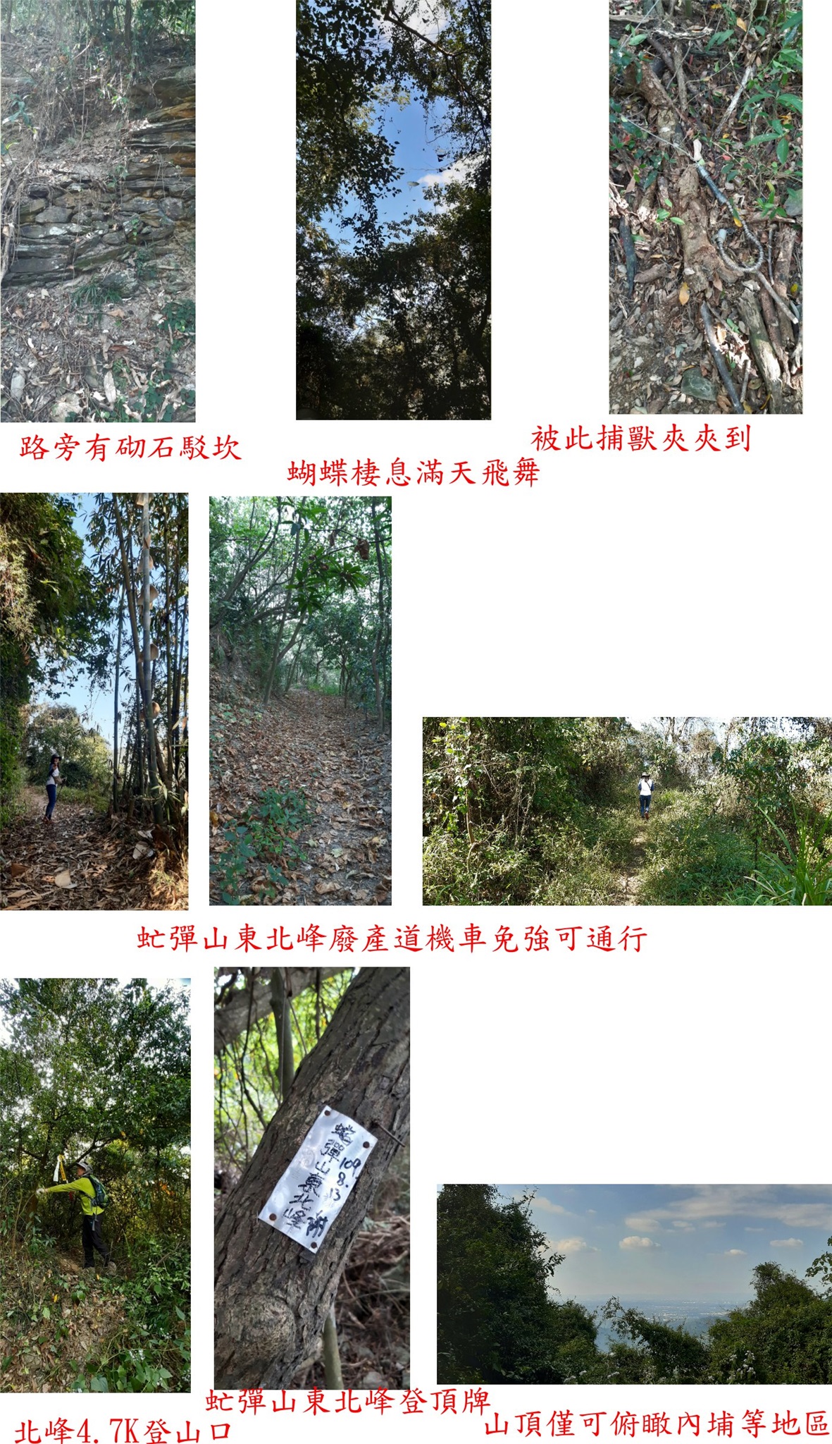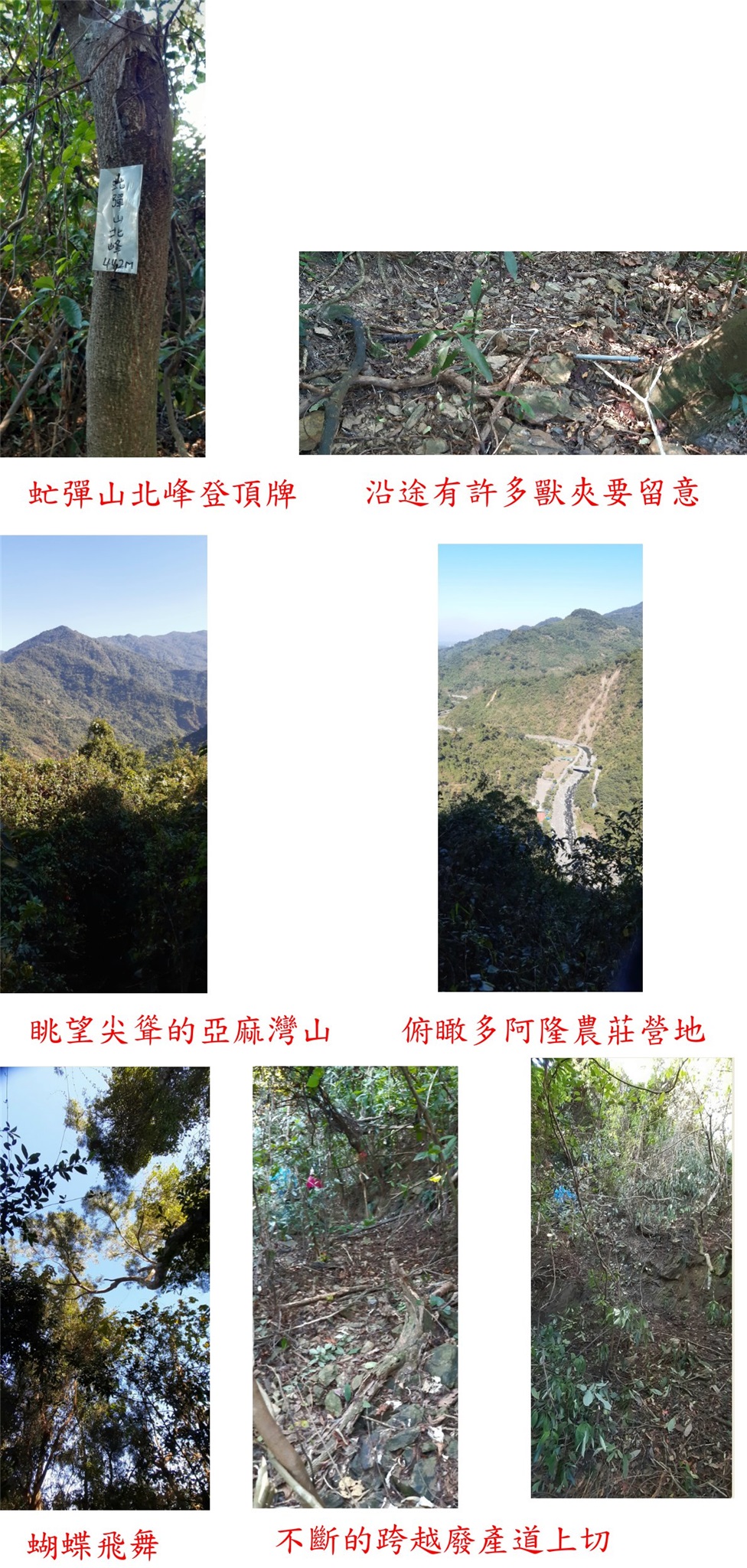 13:10虻彈東北峰4.7K登山口,高511公尺,終於看到路條,山友係走虻彈山主峰方向的南面的農路上山,我們則走虻彈山東北峰北面的農路上山;此山於此為多股稜地形有點複雜,不能順稜續行,續跨過2個小谷地接到第3條支稜,順稜緩下走約80公尺;稜線上被捕獸夾套到登山鞋,懶得脫鞋解開竟然被鋼索套住中指有夠痛,信堯將彈簧鬆開方解套可怕的經驗。