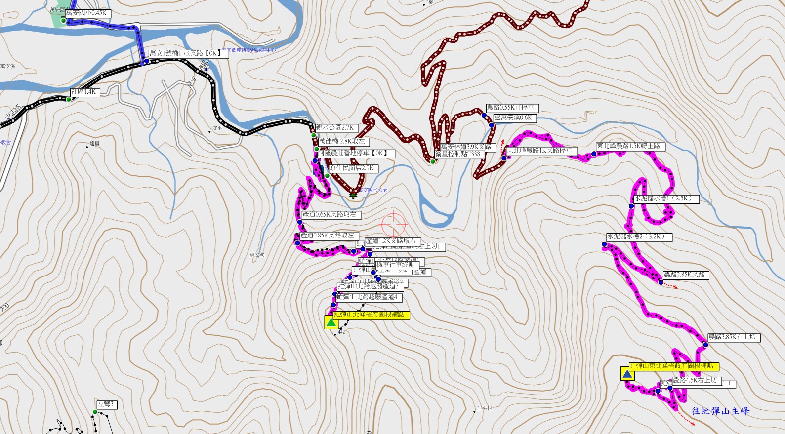 11:07由多阿隆農莊營地右轉過萬佳橋,接萬安林道上山至3.9K叉路【0K】,取右新鋪水泥農路下坡走0.55K,溪底前路右有空地可停車一般車輛可停此;續前行於0.6K涉水過溪,小水泥路上坡續走約0.4K。