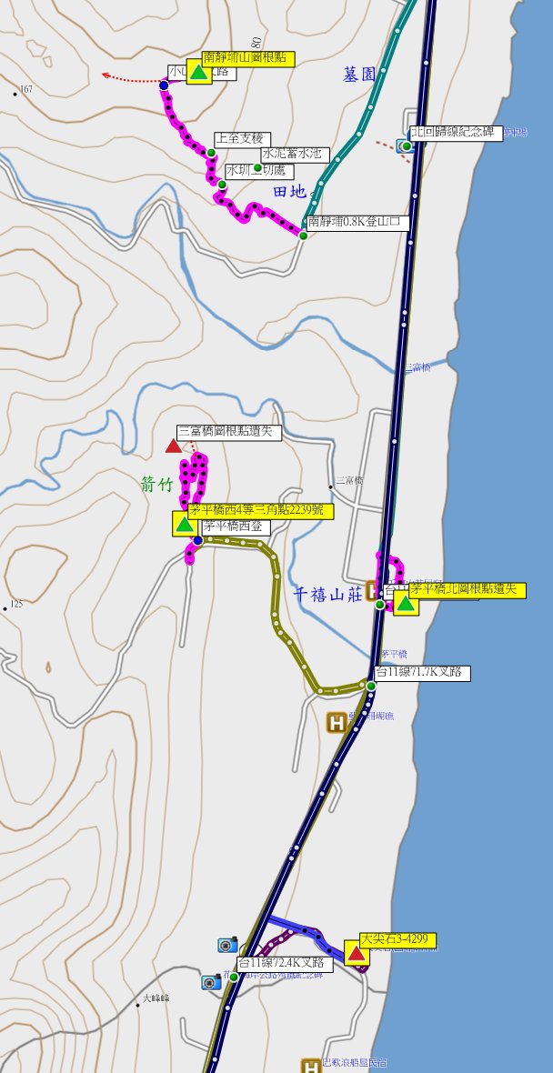 4、南靜埔山:位於花蓮縣豐濱鄉,標高127公尺,土地調查局圖根點。