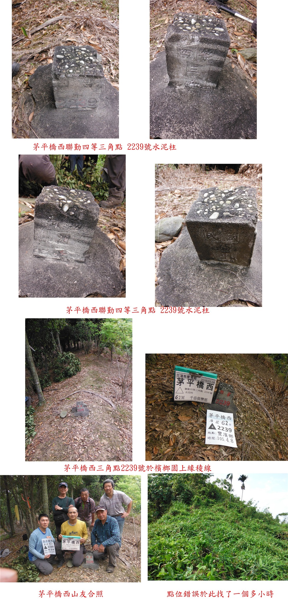 花東基石之旅第一天早上去走水母丁等3座山,下午第1座的西姑子律山3-846,上山最後一段另闢新路,路況尚可,上山走46分鐘,冷門的郊山,熱到快中暑;第2座的茅平橋西的四等三角點2239號,其實上去只要2分鐘,因基石資料庫的點位有誤,往返費時1小時又45分鐘,浪費不少時間;第3顆的茅平橋北圖根點於海邊,此點所在已變成水泥地已遺失;第4座的南靜埔山圖根點,上稜前路況差要砍,上山走36分鐘,有夠冷門的郊山;第5顆的大尖石3-4299於海濱,此點8年前曾來過。