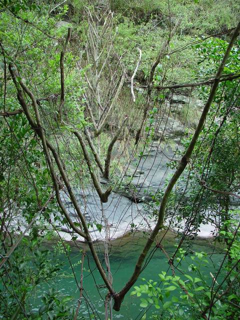 準備過V形橋。這座橋和舊大武和萬山二號的鐵索橋不一樣,成V字形,綁以藤木,橋面甚窄,約二十五公尺長,架在山間狭谷處。這種V形藤索橋連獵人阿吉都沒看過,因為往來還算頻繁,橋身維護的不錯,這也是唯一一座走過後,還笑得出來的索橋,更何況小孫說終點已經不遠了。