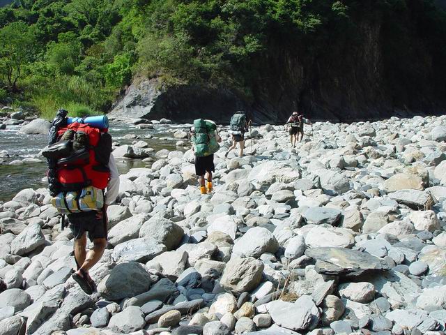出發之前他先給我們心理建設,整整裝備,因為前段要過渡溪六次,建議脫下登山鞋,穿短褲、著短襪,最好兩雙以免割傷打滑。最深最危險的急流,一人先游過去拉繩,每個人渡河時綁上繩子以免沖走,背包則由他們扛過去,最矮小的我,可能會沒頂,到時還得游過去。