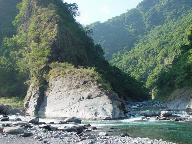 到兩溪交會口(濁口溪 &馬里仙溪 ?)。濁口溪奔流在群山之間,迂迴蜿蜒,貫穿整個茂林鄉,可說是魯凱下三社的生命之源。這幾天沿途經過不少深潭、瀑布、溫泉、陡切峭壁,濁口溪溪谷十分深遂,走在溪谷上方的獵徑,一不小心就會摔下來。現在下到溪谷,則見明顯的S形曲流,河川性格十分強烈。