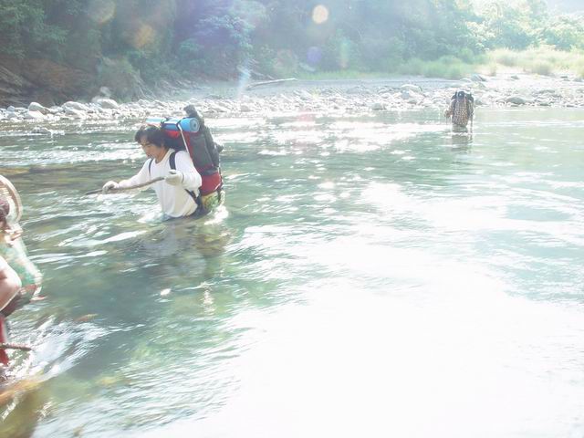 第二次橫渡,水深及腰,水流不急,但大背包底部浸濕,所有的相機都收起,只剩我這部以便紀錄