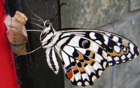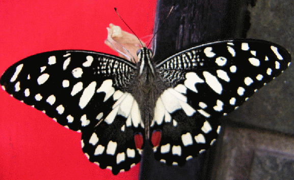 謝謝Annie姐 確實是鳳蝶科的無尾鳳蝶 在找資料時一直不能確定 她的翅正反顏色都不一樣 無尾鳳蝶是都市中常見的蝶類 只要在陽台上種上一顆柑橘植物 就會吸引雌蝶前來產卵 如果想要了解蝴蝶生態 飼養無尾鳳蝶是不錯的選擇