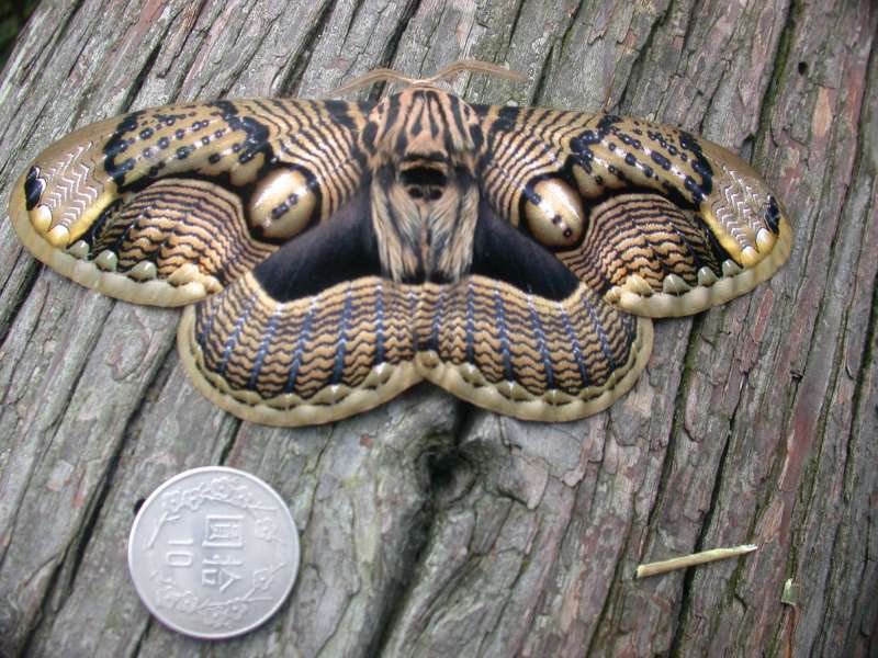 蘿紋蛾科:枯球蘿紋蛾Brahmaea wallichii 外觀特徵: 展翅寬129~152mm。本科在台灣僅此1種。翅膀表面褐色,具排列整齊的波浪狀黑色線條與大眼紋。雌雄差異不大。 除了冬季外,成蟲生活在低、中海拔山區。夜晚具趨光性;在阿里山地區被稱為「阿里山神蝶」,並傳言會在神廟聚集、顯靈。 阿里山的神蛾(枯球蘿紋蛾)數量依照往年的經驗,會在農曆三月初三(今年是四月十一日)達到最高峰!最多可達二十隻以上!
