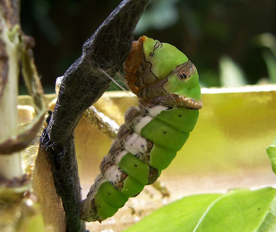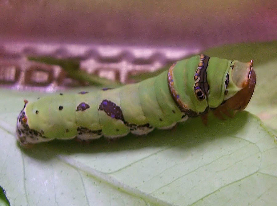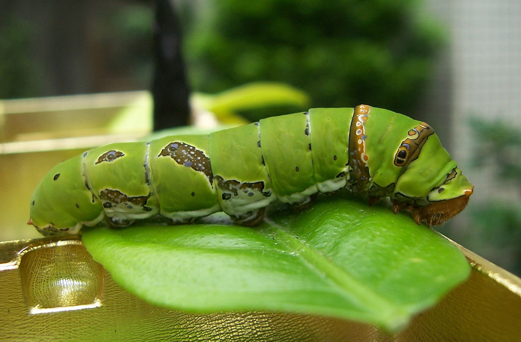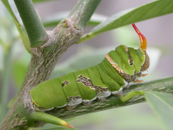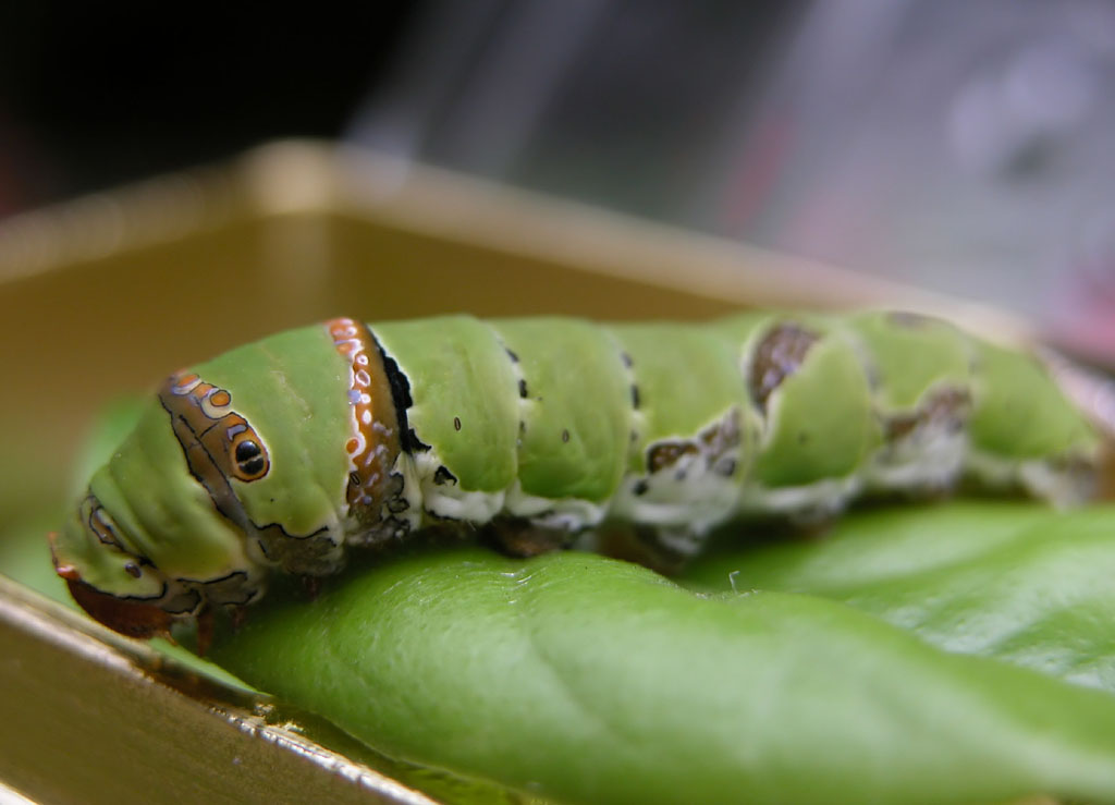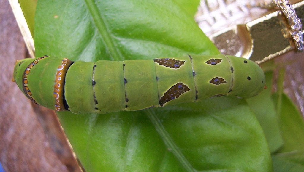 忘了家裡妹妹養了一隻毛毛蟲, 這隻毛毛蟲好命, 吃檸檬葉長大, 小時(約三齡前) 又黑又醜得像是一坨鳥大便一樣混身是刺, 今早一看醜小鴨竟變天鵝, 皮膚變光滑漂亮, 如圖示.