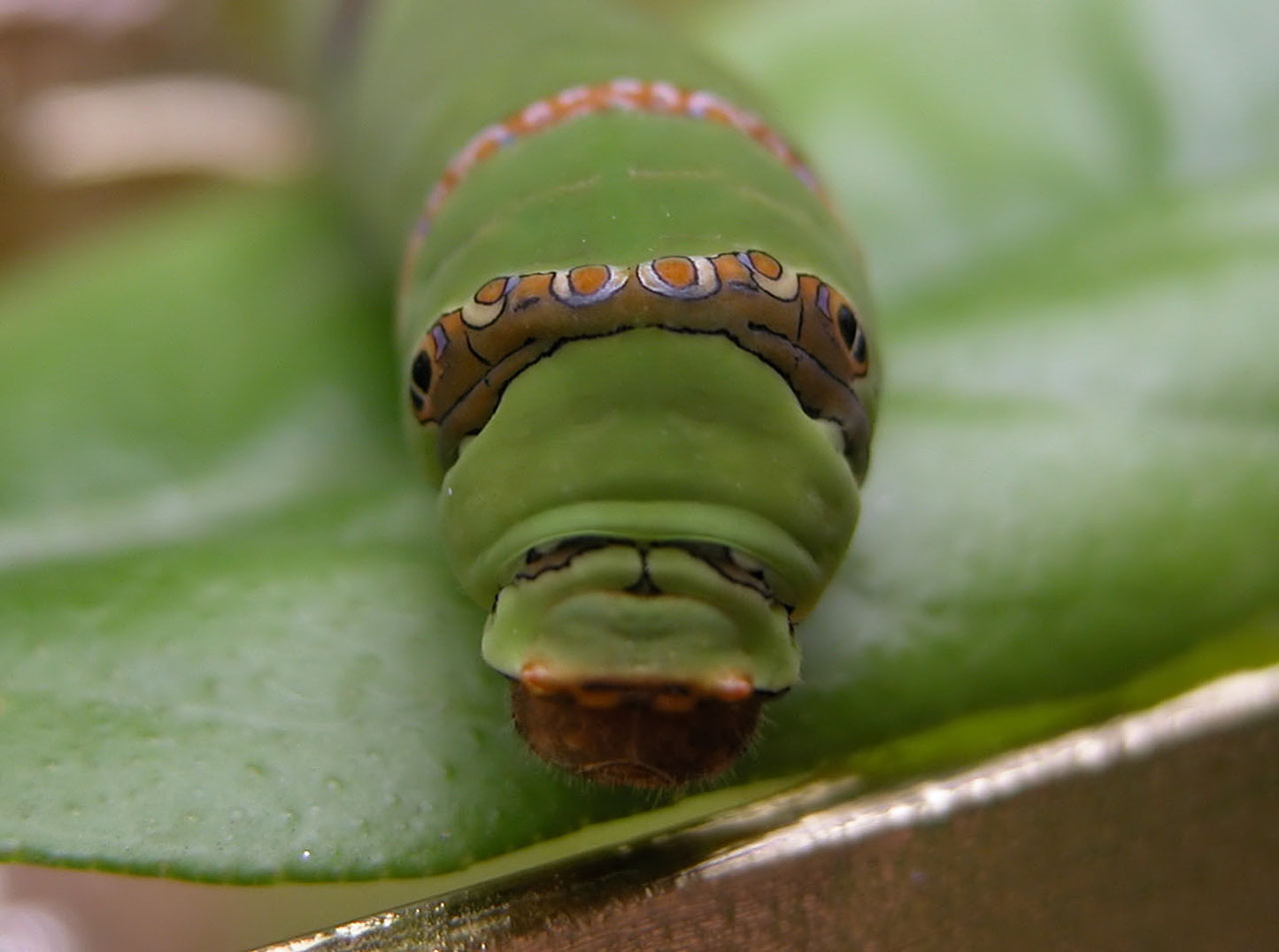 我家這隻蟲, 不會生氣, 所以不會冒出 Y 字蝸牛眼嚇人. 算一算又過了5天了, 還是拼命在吃. 附上大頭照, 身上花紋蠻漂亮的.