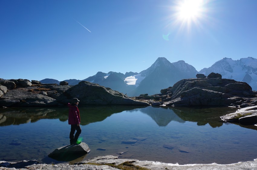 一早從聖莫里茲的飯店出發,備齊食物與飲水,先搭乘纜車到柯爾瓦奇峰 Corvatsch,途中經過三個纜車站,不一會就可以到達山頂旁的纜車站,眺望遠方的阿爾卑斯山群,天氣好的時候,還能瞥見馬特洪峰山頂的小三角,並且也能看到聖莫里茲整個城市與山脈。