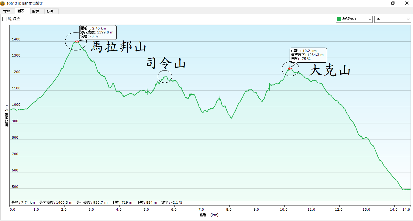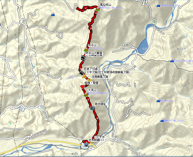 註:1.全段路徑雖路條稀少,但路跡清楚,不致迷路。但司令山至大克山此段,常需拉繩陡上陡下土路,