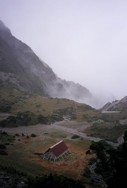 1000 雨停,兩人決定取水去,為了不讓準備過中央尖溪的溯溪鞋無用,決定穿溯溪鞋取水去。上至圈谷傳簡訊,手機訊息有兩格,約五分鐘後寫好簡訊,濃霧上來又沒訊號了,失望的回山屋。後,探主峰路,霧又慢慢上至圈谷,怕下雨,15分鐘後折返。