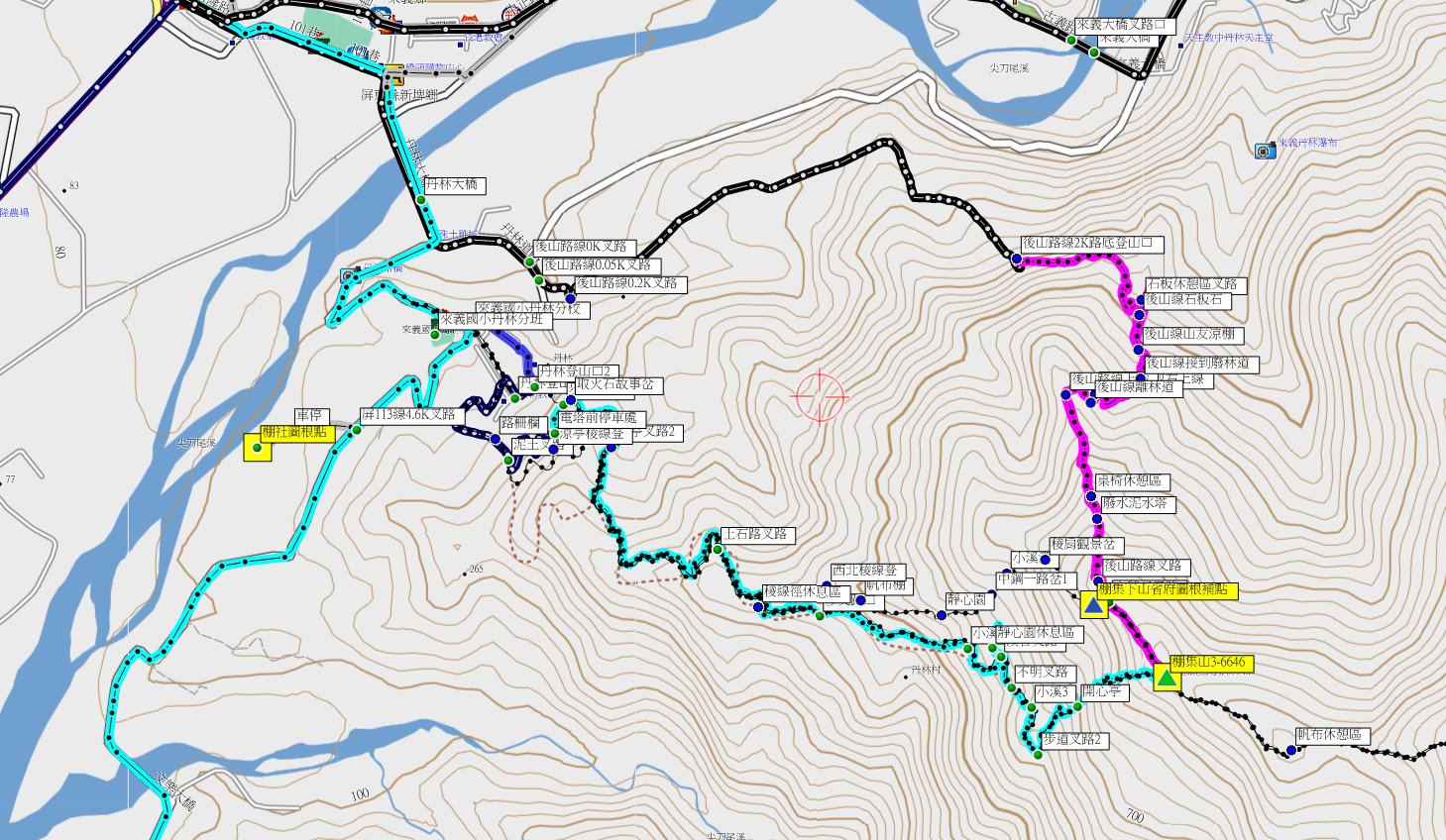 06:25潮州市區出發,出市區接屏110線(通潮路)往東走1.9K叉路,取直接屏110線(潮義路)往東走6.1K,取直新隆路進入古樓市集走0.6K;右轉連路道路經丹林大橋走0.55K叉路,右可通往丹林村登山口不取,取左屏113線走0.35K叉路【0K】,取右走約50公尺叉路,左轉不明顯小路至0.2K路,右上亦可通往丹林村登山口不取,取左水泥小路上山續行約1.8K。