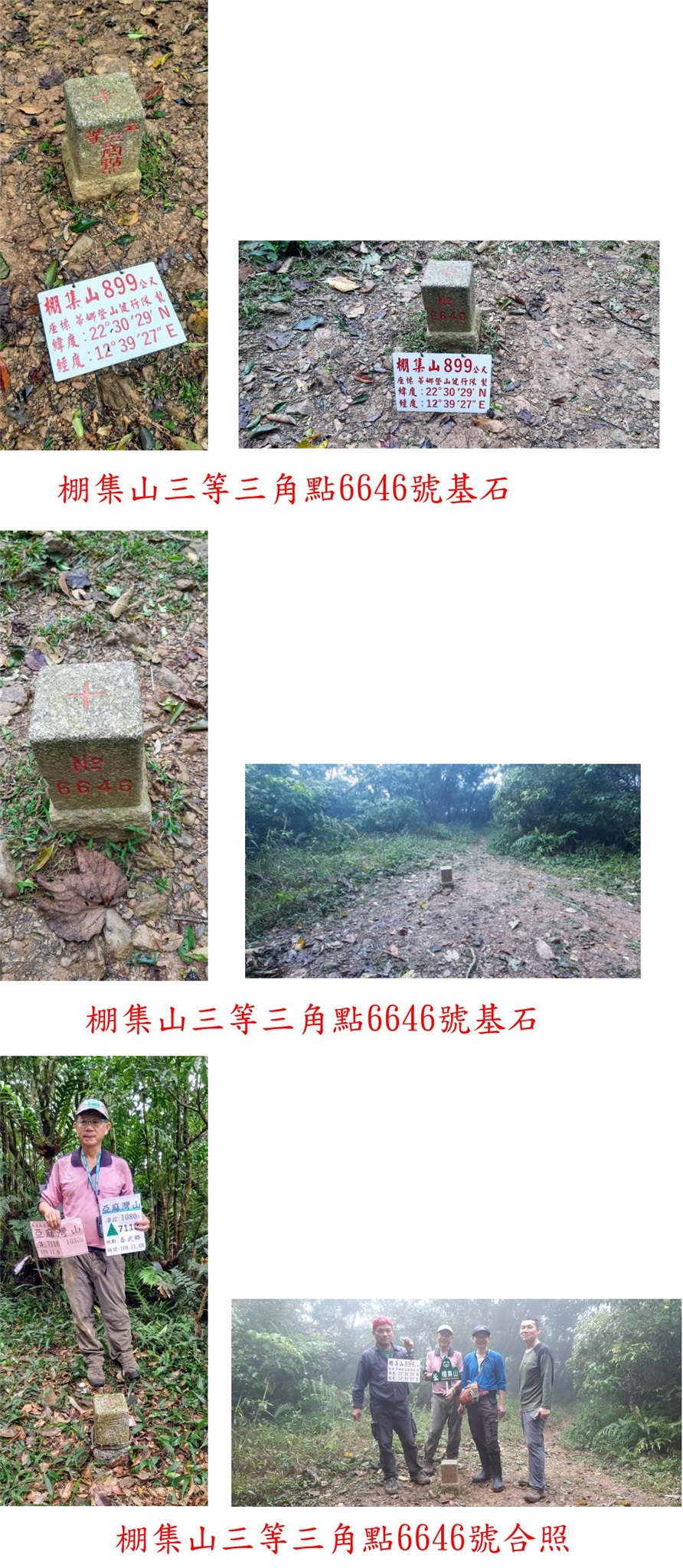 09:09△棚集山,高882公尺,三等三角點6646號基石,此山為小百岳之一11年前曾來過;山頂於樹林間無展望,涼棚有許多山友在泡茶,順稜續行有山徑通往久保等山,右另有山徑可下丹林村登山口(上回曾走過)。