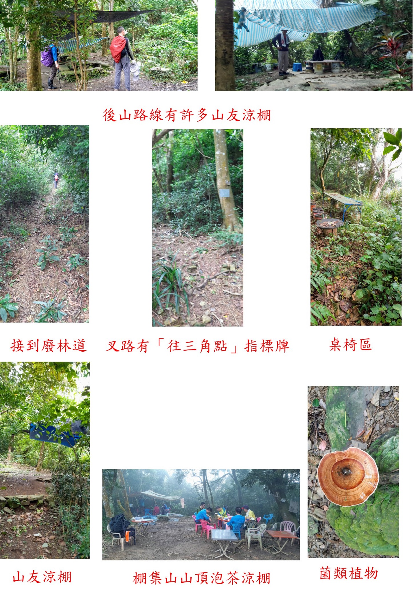 07:48山友涼棚,叉路頗多大多通往泡茶的涼棚,沿途叉路均有「往三角點」指標牌。