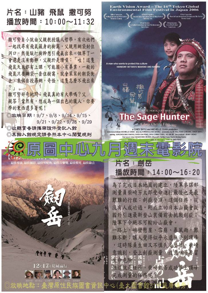 另外即將來到的秋天是個很適合登山的季節,而大山頂上所埋的「三角點」是老一輩的原住民扛到山頂埋下去的。九月的週末電影院選了一部非常經典的山岳電影《劒岳》,劒岳是當時日本最後一座尚未有探勘隊成功登頂的山,這是一部有關三角點、地圖測量,以及山與人之間的電影,推薦給喜愛山野的朋友們!!