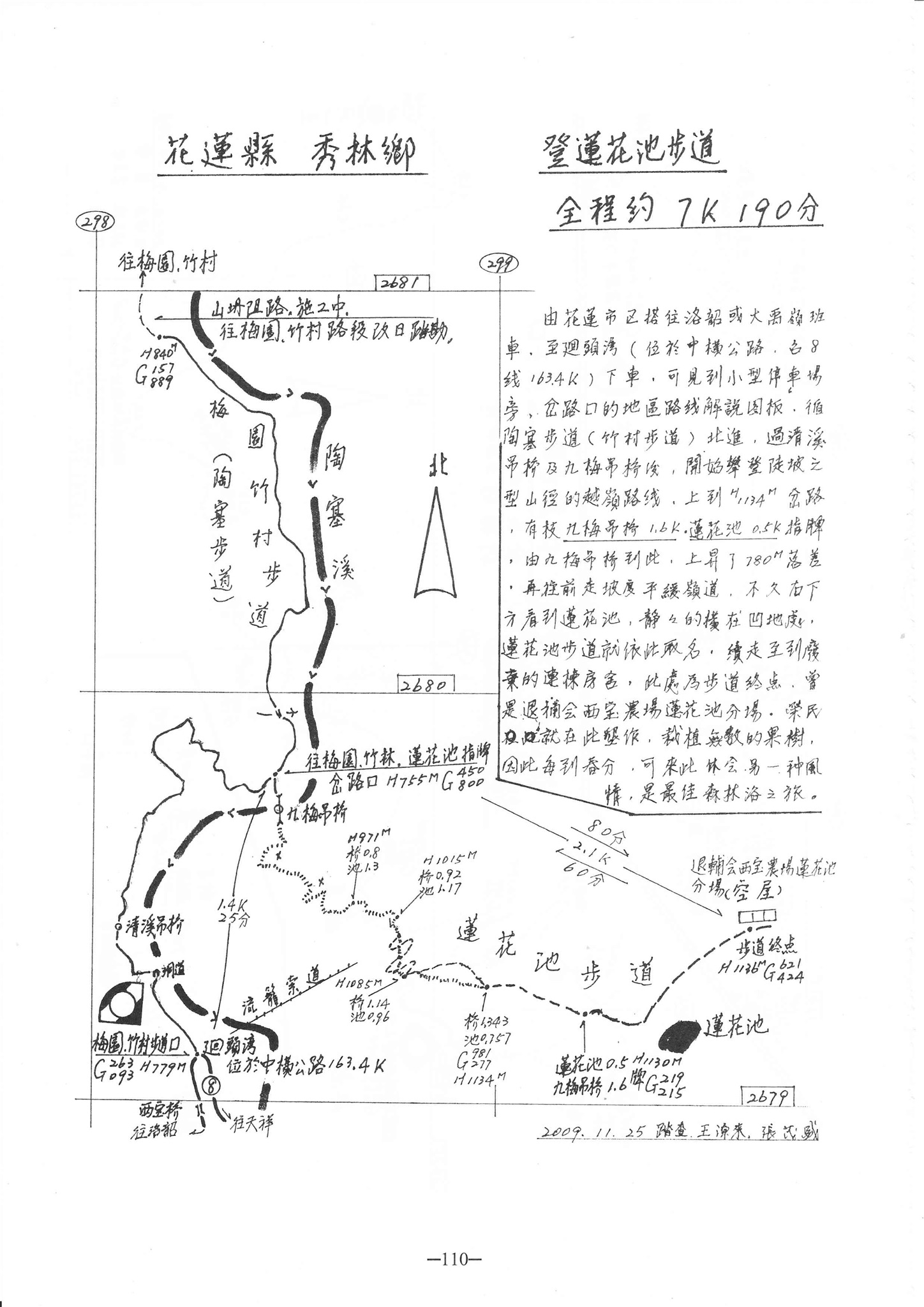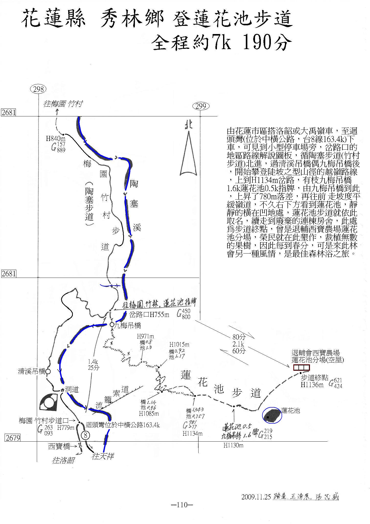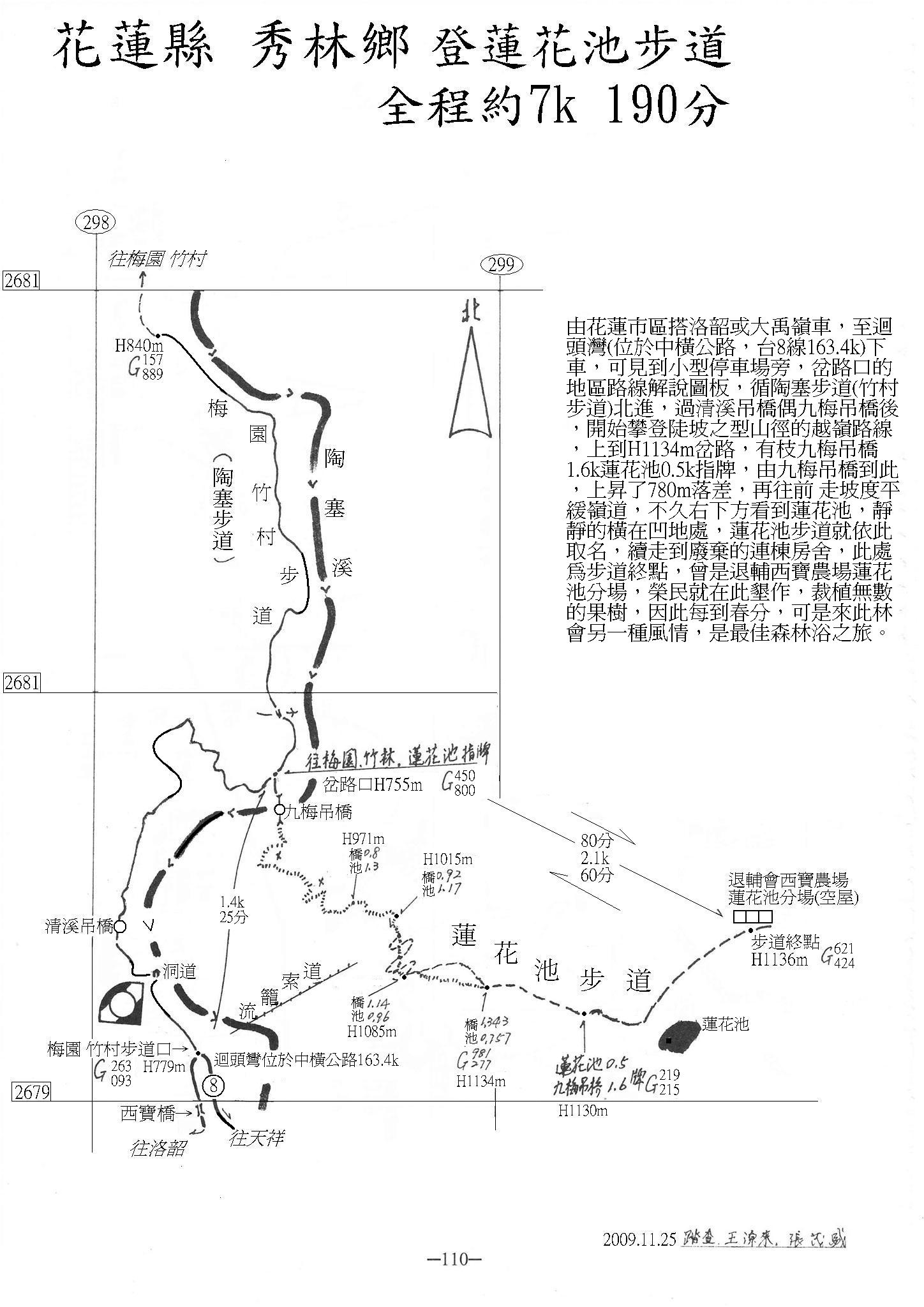 由花蓮市區搭洛韶或大禹嶺車,至迴頭灣(位於中橫公路,台8線163.4k)下車,可見到小型停車場旁,岔路口的地區路線解說圖板,循陶塞步道(竹村步道)北進,過清溪吊橋偶九梅吊橋後,開始攀登陡坡之型山徑的越嶺路線,上到H1134m岔路,有枝九梅吊橋1.6k蓮花池0.5k指牌,由九梅吊橋到此,上昇了780m落差,再往前 走坡度平緩嶺道,不久右下方看到蓮花池,靜靜的橫在凹地處,蓮花池步道就依此取名,續走到廢棄的連棟房舍,此處為步道終點,曾是退輔西寶農場蓮花池分場,榮民就在此墾作,裁植無數的果樹,因此每到春分,可是來此林會另一種風情,是最佳森林浴之旅。