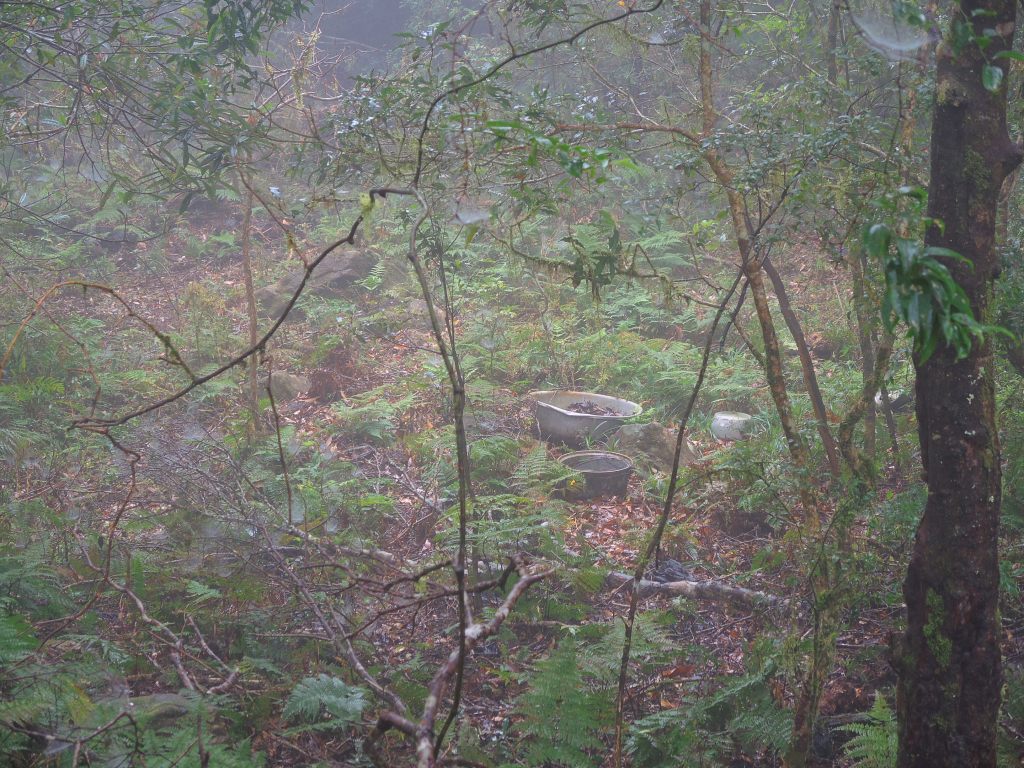 0925 1650鞍部平坦地有獵寮遺址。有臉盆之類的東西。一路上各種動物的排遺相當多,顯示動物相豐富。此地判斷應可下切蓬萊池。地上有發現東港博岳的舊路條,不知道早期他們是由何處到此!