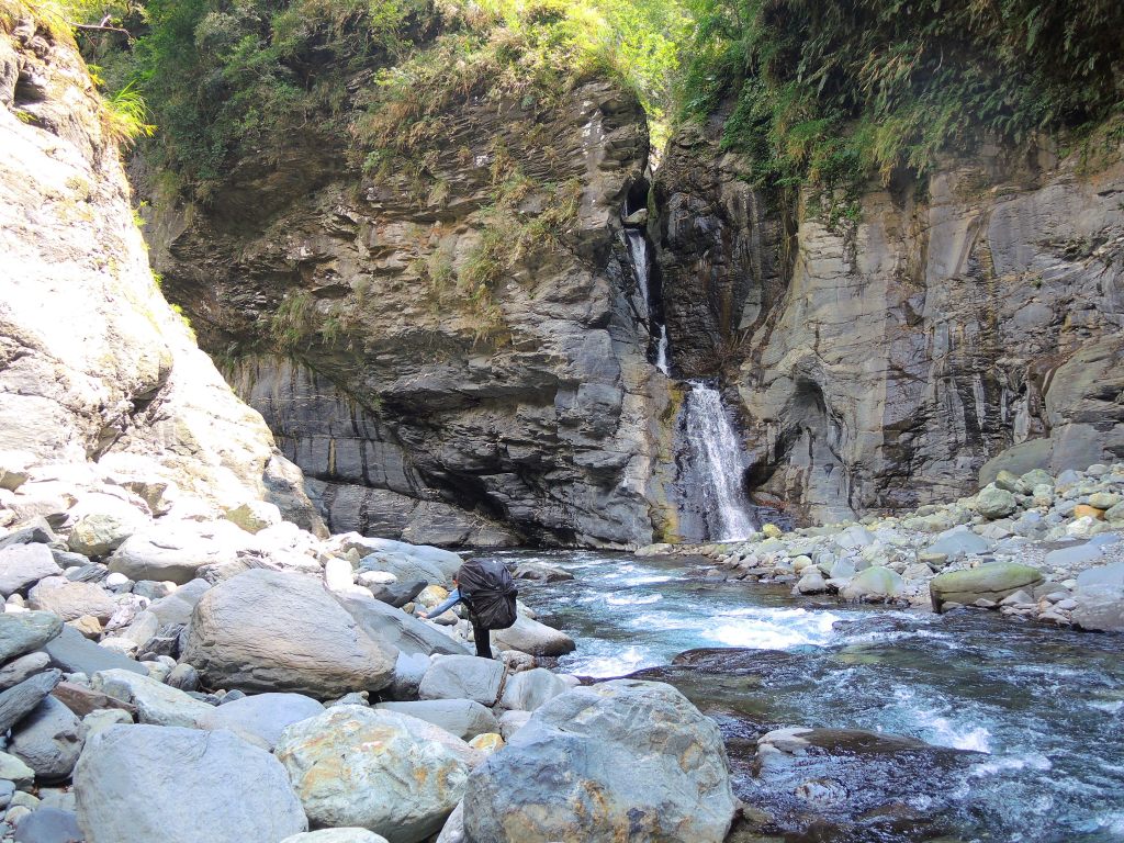 1500 滙流口紮營。行程嚴重delay大家商量下一步對策!老蔡說,加大奈、見晴都去過了,可以不用考慮,這一趟中之山、蓬萊山能拿下最重要。要原路來回要溯溪又超級麻煩。要由知本林道出去,很完美不用溯溪,但是就少半天時間。再來就是兩天輕裝各攻兩座。因為我們的紮營點,有稜線直上,可先到蓬萊池再取蓬萊山,只不過來回約要9公里,路況又不明。大家腦力激盪,想到何不重裝上中之山,輕裝來回蓬萊山,再下溪紮營。今日早早休息,準備兩天的苦戰!