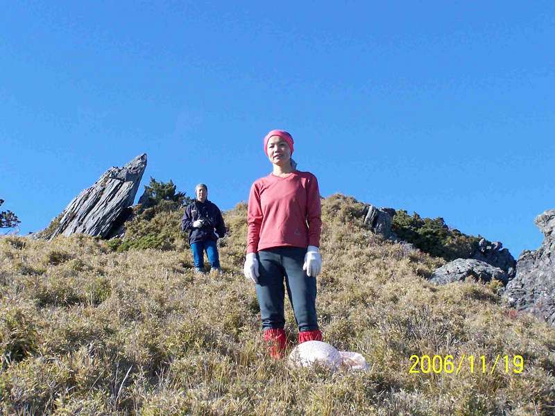 10:00到達第一站向陽山屋(4.28K H2850M),取水休息。12:05好好池營地午餐。13:51向上到向陽名樹--圓柏長年抵抗強風曲身挺立於山間,孤傲不群,澟澟生風。再向上向陽崩壁,深800公尺的崩壁,直下南部橫貫公路,俯望不免心空腿軟。再再向上到向陽山三叉路口(H:3460M 7.45K)鐵人夫妻早己引擎全開,不見人影,所幸上坡終於結束,眼前的向陽山(3603M)不是今天的目的地。叉路取右,緩坡腰繞,景緻不再險峻懾人,放眼山巒全變成溫柔的弧線,南望關山、北大武,放眼千里,一時胸懷盡展。路過巨石向下,過亂石坡,15:20終於到了今天的休息地嘉明湖山屋(8.4k)。