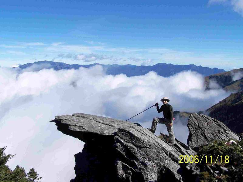 08:20出發到向陽山第二叉路口,輕裝攻向陽山(H:3602M),預估僅1K而己,沒想到箭竹、亂石,不時陡上,一行人氣喘如牛。09:25登上此行最高點,看著往向陽北峰的陡坡長路,還是快快下山上路。山腰間一石突出一平台,流雲來伴有超然遺世的古風,留影後繼續前行。