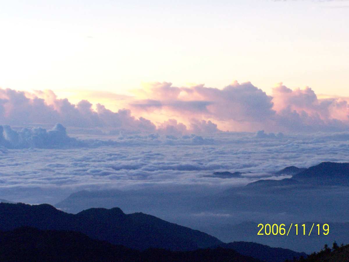 50公尺山坡後方就可以欣賞日初雲海的萬千變化,山風凜冽,不時發現顫抖山友們臉上有興奮的笑容。雖然手都凍僵了,但是眼下霞光流轉、雲影翻騰,刻刻讓人目不暇給。美景壯濶。有人拿著相機狂拍,有人依偎守著第一道陽光,有人用笑鬧寫生青春,有人用歌聲回憶天涯故人。