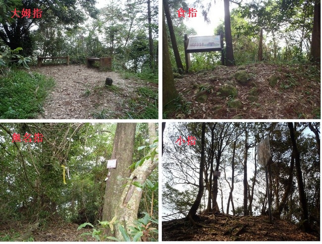 一般人爬五指山, 大都從竹林禪院登山口, 至大姆指或食指, 便原路來回, 此路線清楚, 不論小孩或老年人, 都可以走, 時間約需3~4小時.