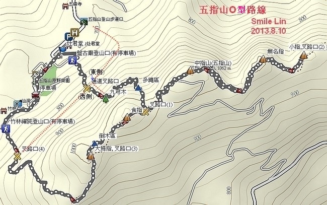 此處提供五指山O型縱走路線, 包含兩個登山口: 竹林禪院及盤古廟. 盤古廟登山口, 可直接上行至食指左側旁, 但路線較陡與稍難, 手腳不靈活, 注意力較差, 及步鞋較滑者, 較不適合. 此O形縱走, 約需4~5小時.