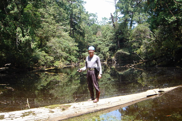 玫瑰池在左手邊(北側台北縣境),週遭紅檜森林圍繞,憑添幾許寧靜與神秘。大紅檜不少,有一顆由岸邊倒向池心的紅檜枯木,正好用來取景。由於近期較少降雨,感覺池面比起前次來的時候縮減許多。由營地空手來回約20分鐘,加上賞景拍照,大夥銷磨了25分鐘的快樂時光。