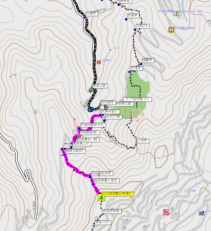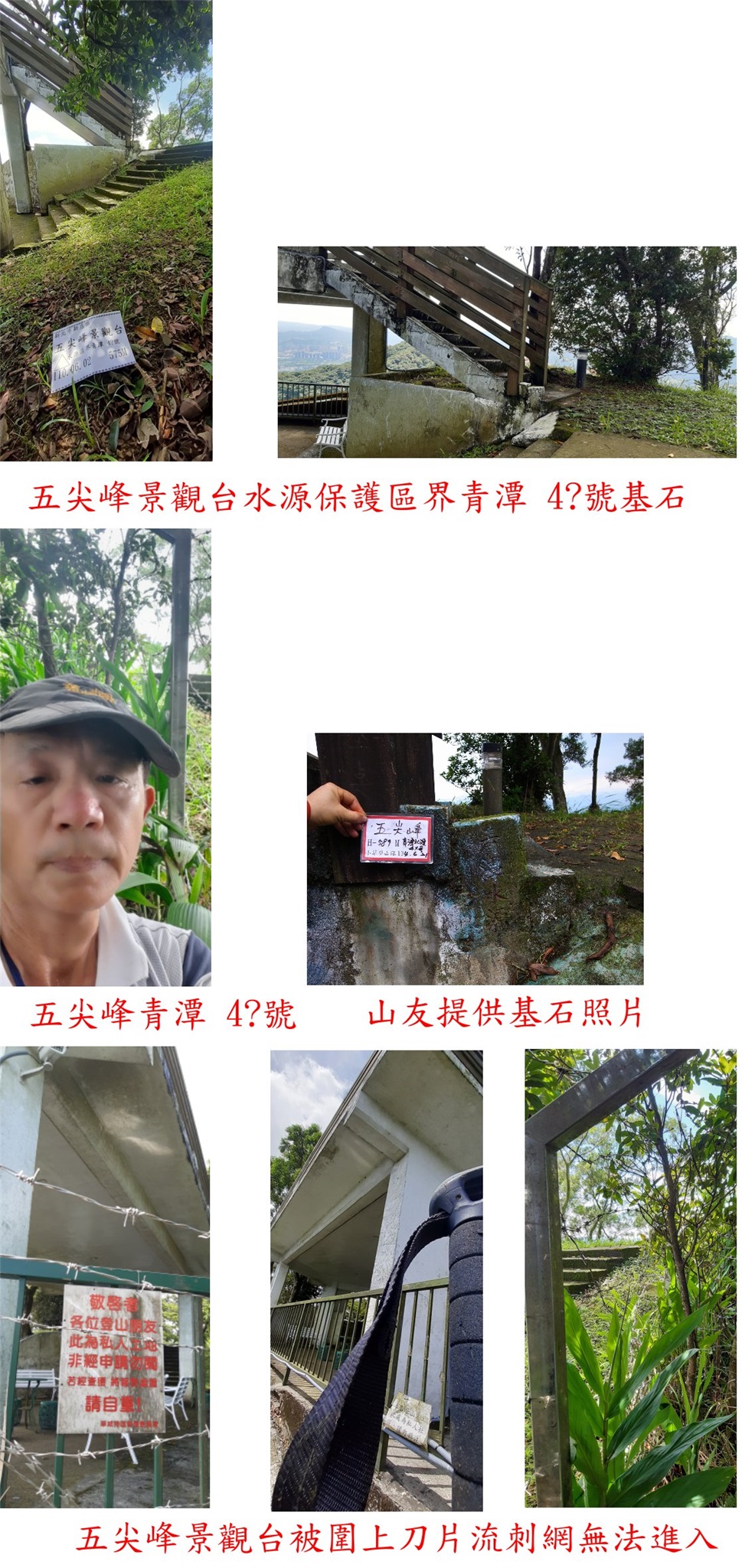 ◎五尖峰景觀台青潭4?:位於新北市新店區,標高575公尺,水源保護區界青潭 4?號;座標299500 2758237。