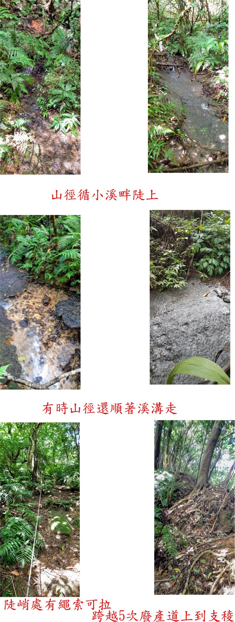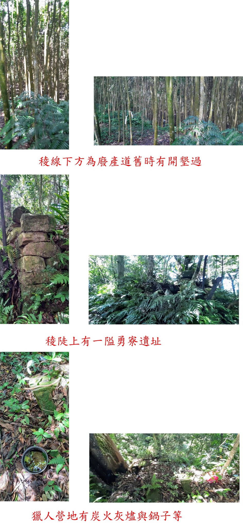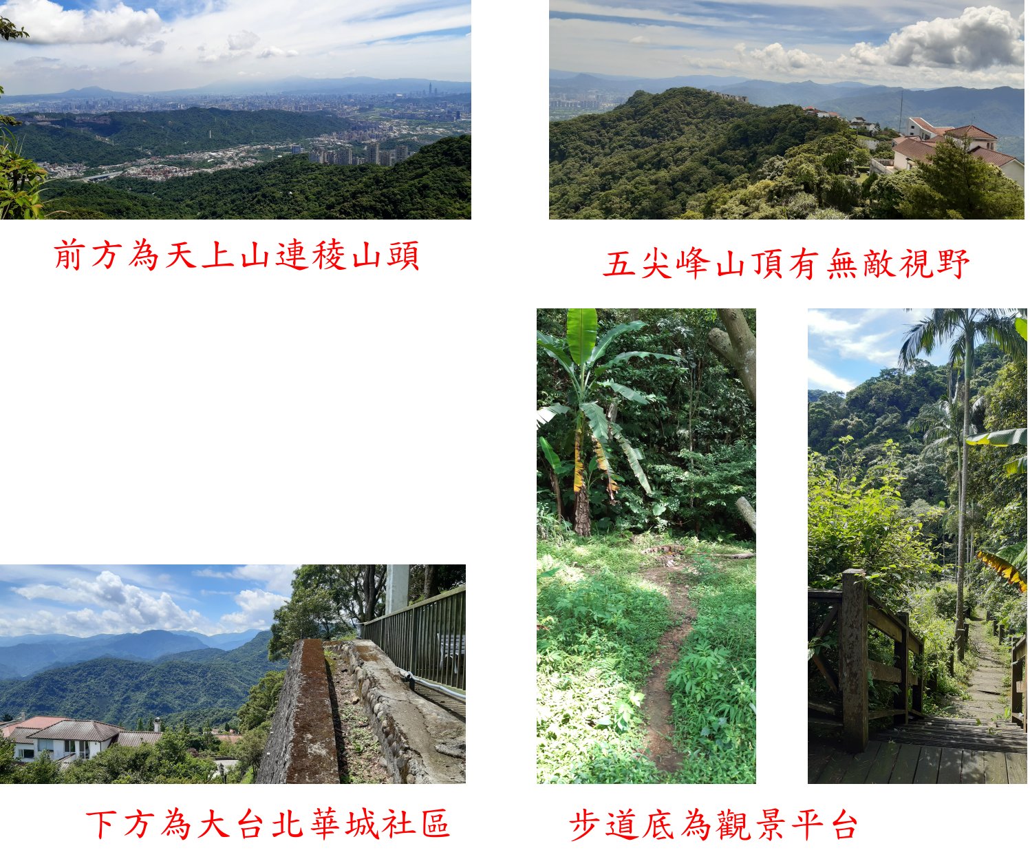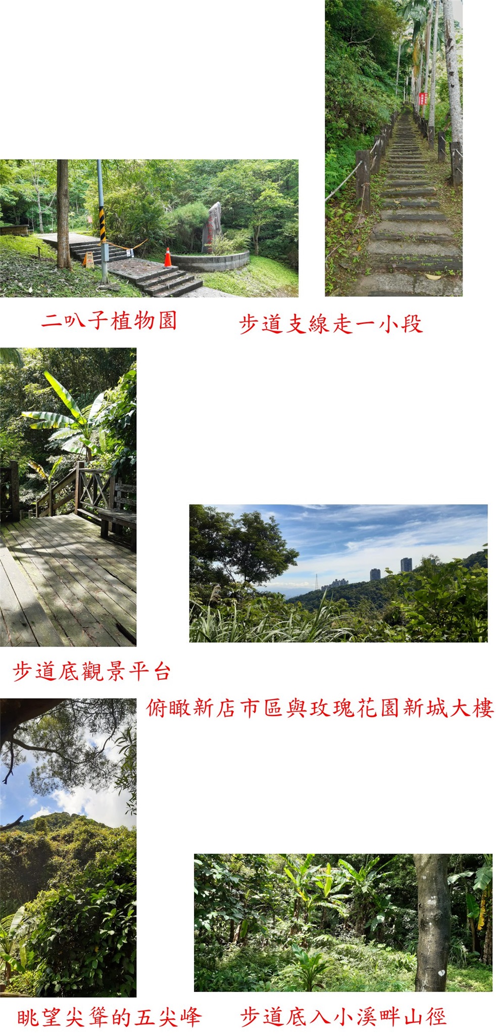 進入階梯步道支線緩上走280餘公尺步道底觀景平台,眺望尖聳的五尖峰、俯瞰新店市區與玫瑰花園新城大樓;取左入小溪畔山徑,此路線少安山友造訪但路況尚可,沿途有路條可循,前方隨即跨越廢棄產道,有時山徑還順著溪溝走,陡峭處還有塑膠繩可拉;山徑一路陡上,大略算一下跨越5次廢產道上到支稜,稜線右下方為廢產道舊時有開墾過;取左支稜走約40公尺叉路,右下有路條猜或許可出安泰路?續順稜陡上走310公尺有一隘勇寮遺址,新店此山區看過許多相同歸個的隘勇寮,此路線舊時應為隘勇路的一段;順稜緩上走60公尺有一獵人營地,有炭火灰燼與鍋子等,前行山徑轉為急陡上,走來汗如雨下悶熱苦不堪言,山徑續走約135公尺抵五峰尖;山頂有座觀景台,屬大台北華城的範圍,社區竟然圍上刀片流刺網阻擋山友進入,看過紀錄以前可以進入不知什麼時候裝上圍籬?順著鐵絲網右繞找不到缺口可進入,可看到五尖峰的水源保護區界青潭 4?號就在涼亭階梯旁,距離約10餘公尺進不去只能遠拍;此點號碼那面緊貼著階梯看不到,此山區青潭水源基石號碼皆為連號,稜上南面那顆為43號,個人推斷此顆應為44號?山頂有無敵視野,此山由大台北華城方向車可直達,但因社區管制無法進入,只能由二叭子植物園方向上山;山徑續行可通往大丘田與粽串尖等山,上山走62分鐘,拍照後原路折返,下山走54分鐘,此山累計爬升327m、路程2.8K,往返費時2小時又16分鐘;下山本計畫續繞熱門的二叭子植物園一圈,但因疫情封閉留待下回早早收兵返家。