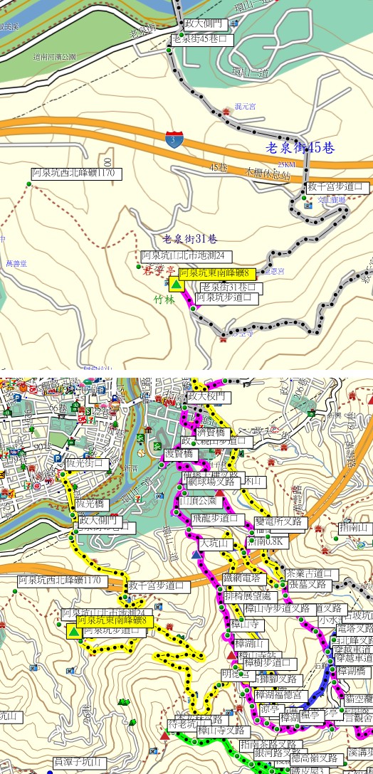 中午與朋友於三峽的春來餐廳享用鱘龍魚大餐,之後又去重新開幕的長城遊樂區喝咖啡,聚會後時間還早就去木柵的貓空山區摸新找到的阿泉坑山礦8號基石;由木新路二段左轉恆光街,過恆光橋後右轉老泉街45巷、往救千宮方向山路走約1.7K,步道口轉彎處已有人停車,改停在步道口前