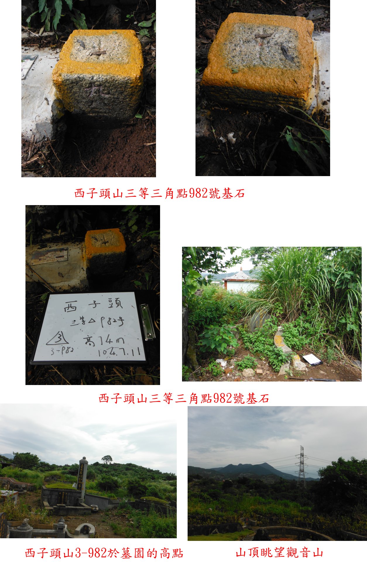 1、西子頭山:新北市五股區,標高74公尺,三等三角點982號基石。