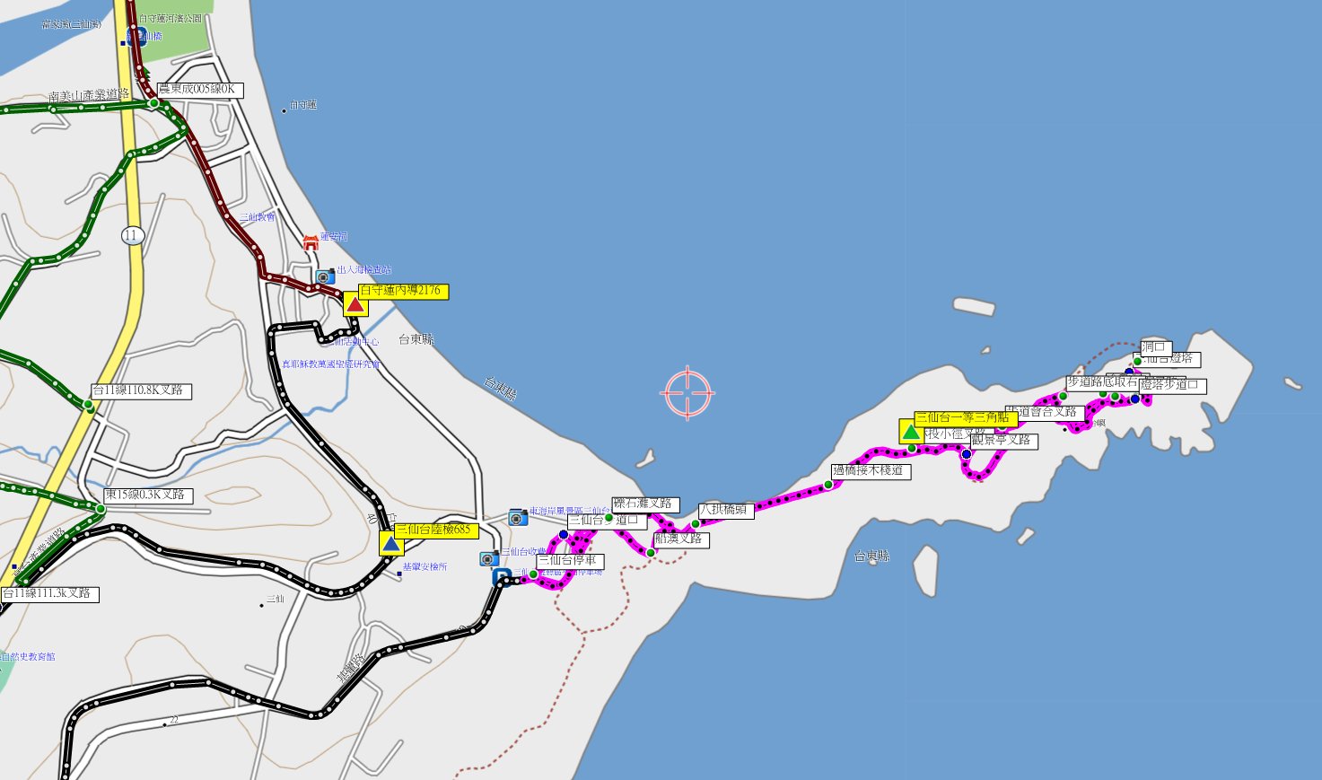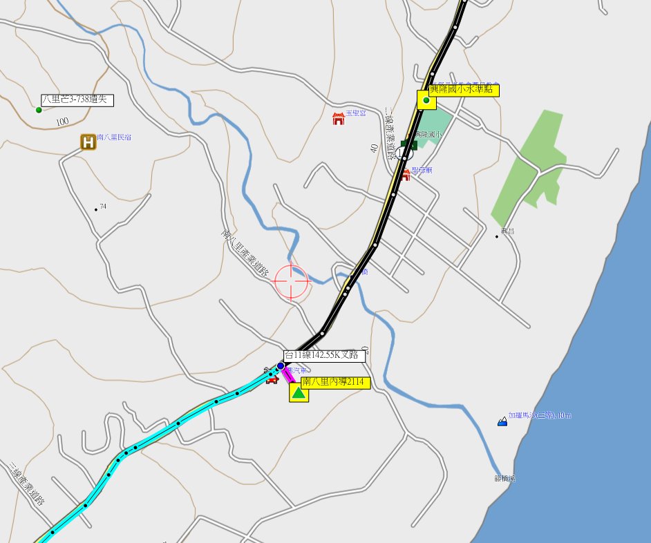 5、南八里:位在台東縣東河鄉,標高43公尺,聯勤測量隊四等三角點內導第2114號銅標;座標274214 2532150。