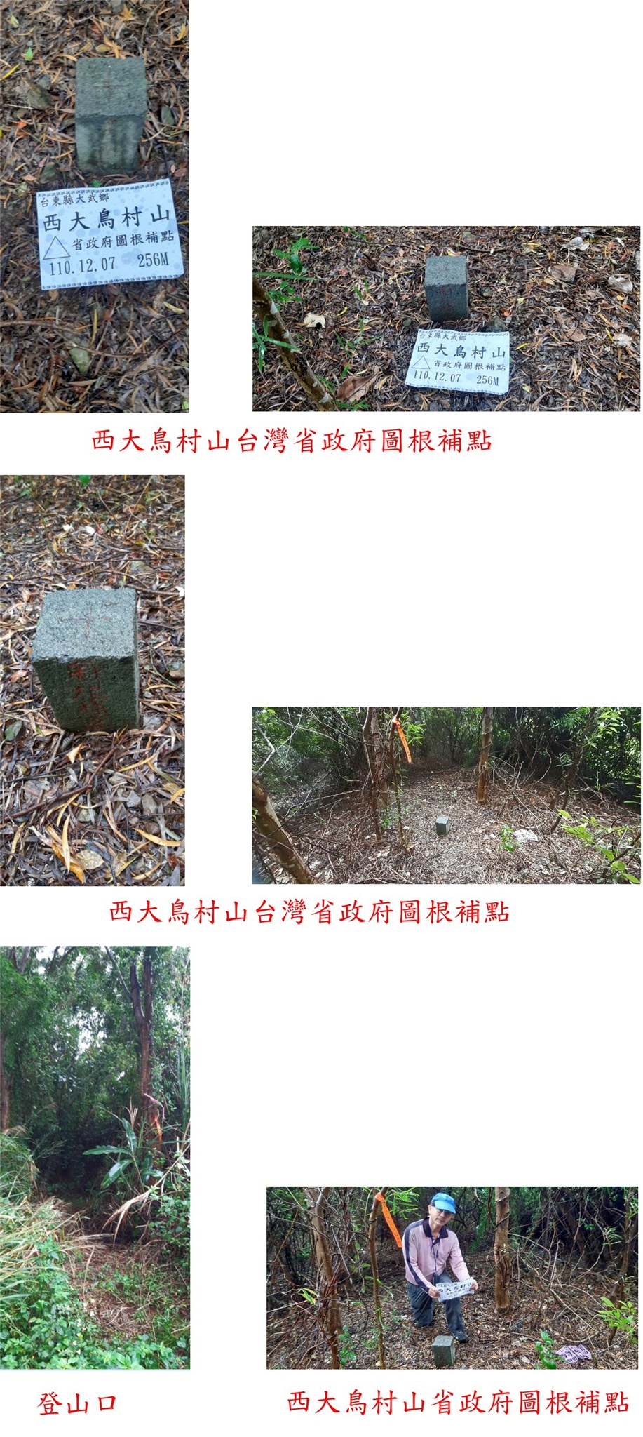 1、西大鳥村山:位在台東縣大武鄉,標高256公尺,台灣省政府圖根補點;座標239246 2476762。