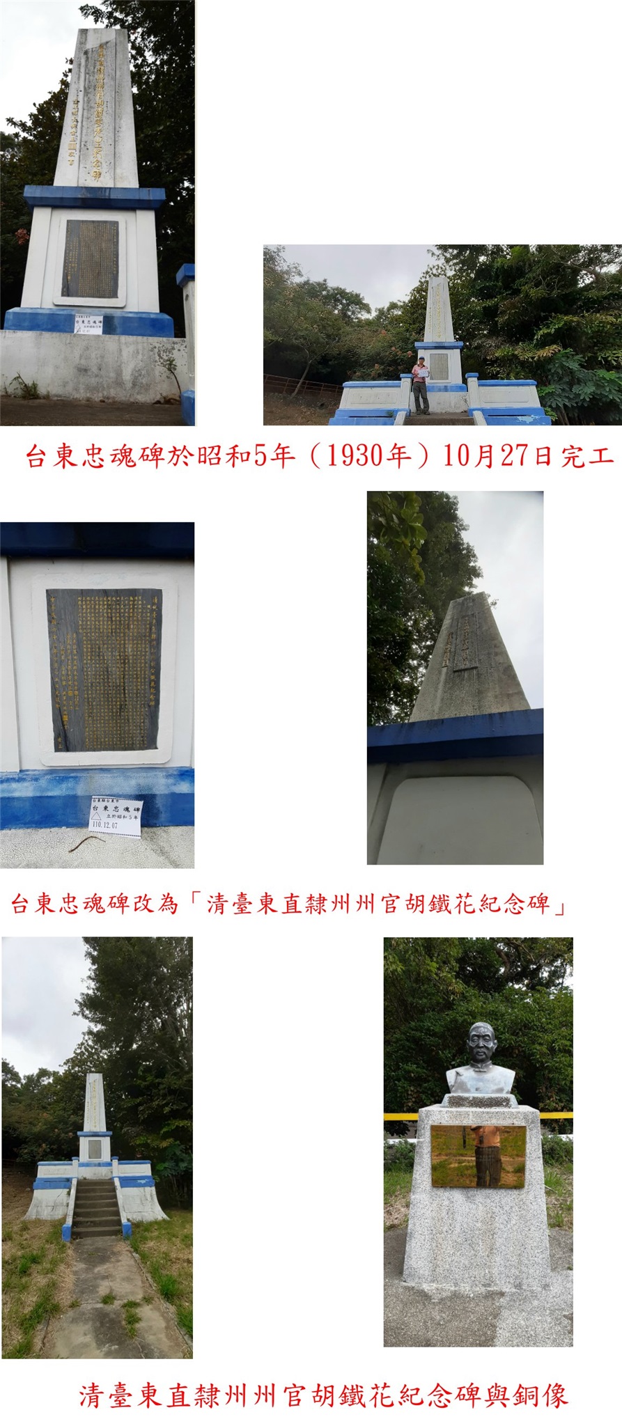 走百餘公尺台東忠烈祠入口,忠烈祠舊址為台東神社所在已改建過,走階梯路網上,階梯路右側有一首屆民選縣長陳振宗之記念碑;詢問後找到台東忠魂碑,興建於昭和5年(1930年)10月27日,係日據時代悼念為國捐軀的軍人和烈士的紀念碑,民國41年胡適博士到台東觀光,縣府將此碑改為胡適父親胡傳(胡鐵花)的紀念碑,上刻著「清台東直隸州州官胡鐵花先生紀念碑」;鯉魚山來過多次以前不知有此碑遠道來補。