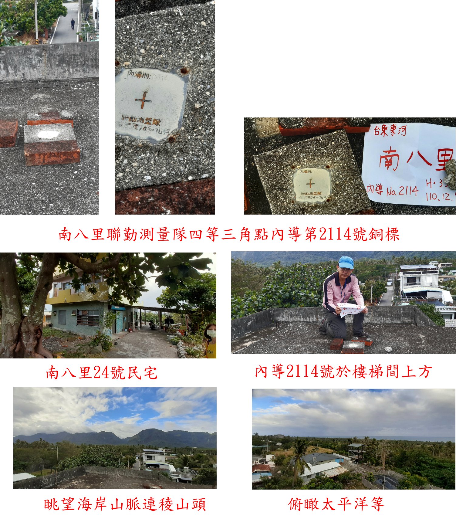 民宅的住戶似乎不堪打擾說最近我已經是第4次來看基點,我猜除了台東阿倫外應是測量隊人員,央求很久方同意;上到民宅2樓頂,基點不在樓地板設在樓梯間上方;好不容易爬上去終於拍到南八里的內導2114號銅標,聯勤測量隊社於民國74年10月,屋頂視野不錯。