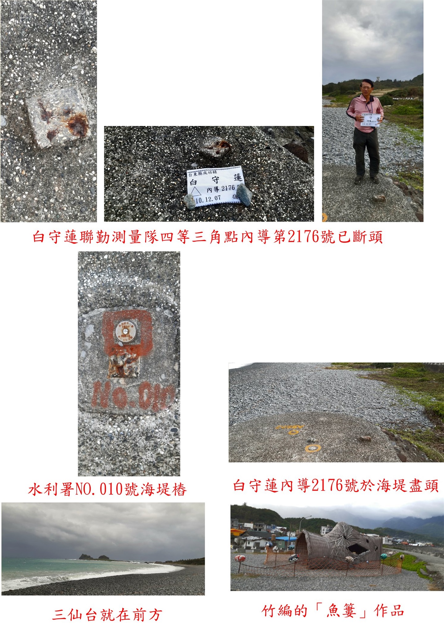 右側白守蓮社區海堤南端盡頭處,見到斷頭的白守蓮內導2176號,看來毫不起眼,旁還顆水利署NO.010號海堤樁;海堤海景不錯,三仙台就在前方不遠處,海邊還有一個竹編的「魚簍」作品。