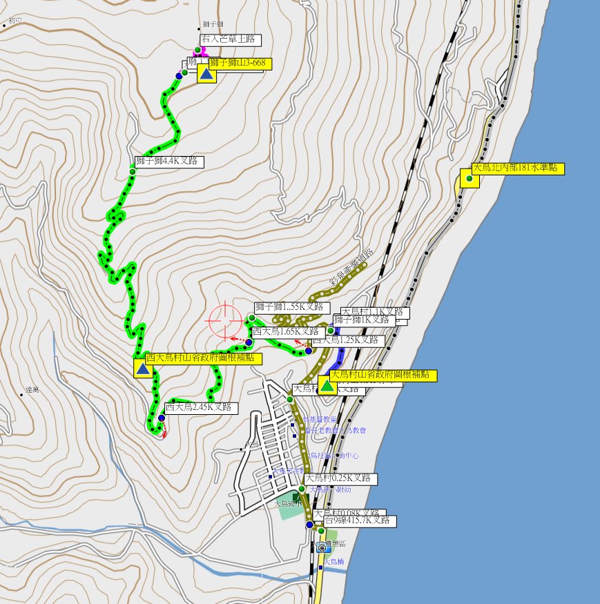 由汀掛山原路回至台9線417.7K叉路,左轉台9線往北走1.9K叉路(415.8K處)【0K】,左轉進入大鳥社區走約