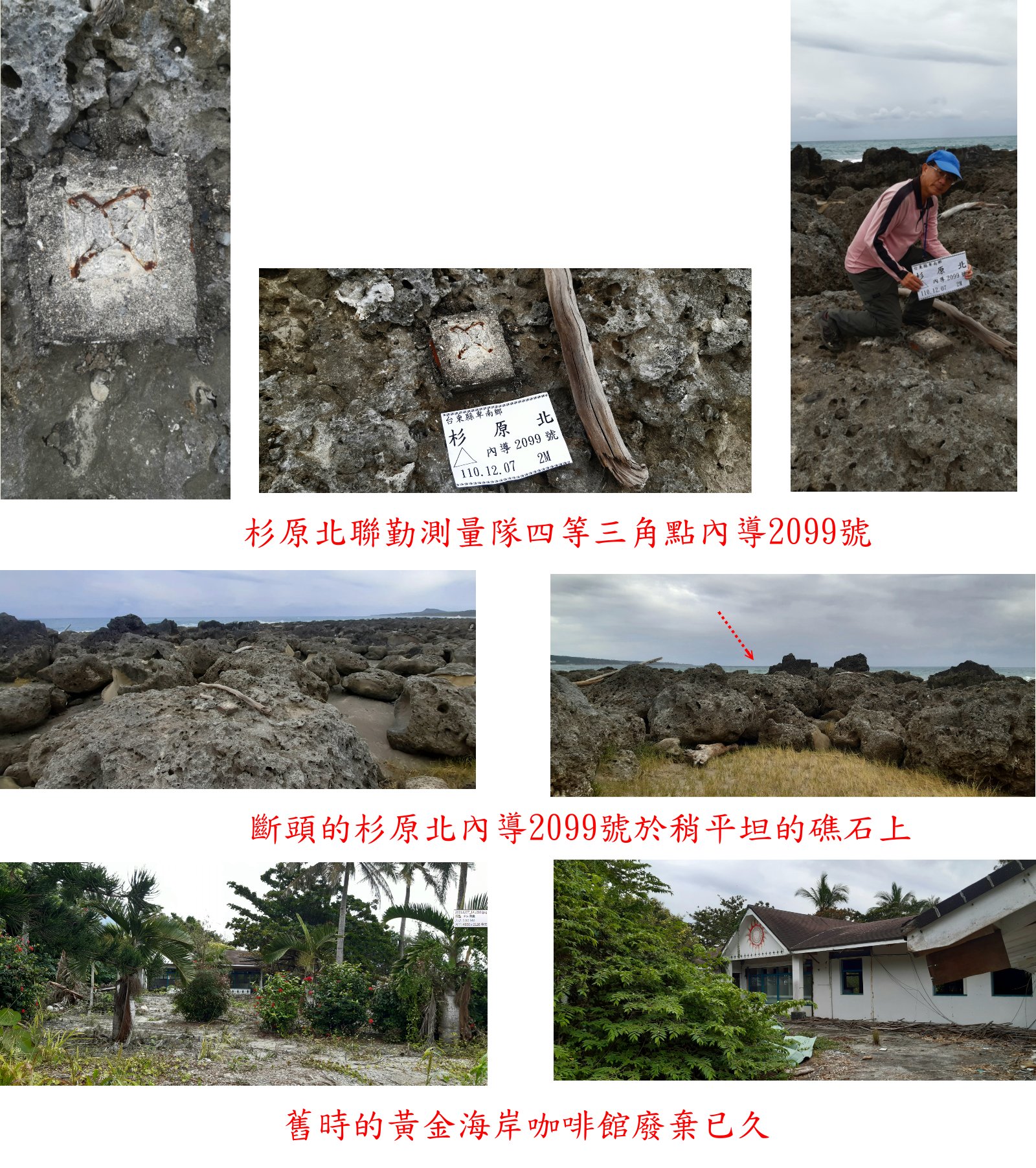 往北穿過停業已久破損的咖廢館建築,有條草長的路走40餘公尺下到海濱,海岸為大小不等的礁石也不知基點於那塊大石上?找了許多於一塊較平坦的礁石找到杉原北的內導2099號,基點已斷頭只剩底座;尋找此點走小徑下到海邊,取左海岸走30餘公尺至漂流木附近,基點所在的礁石距離海濱約
